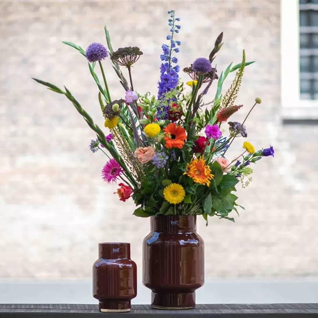 Mouth-blown, The Rokko vase with sleek Dutch design is crafted from rich, heavy, luxurious glass; thick European glass, opening holds long-stem bouquets and centerpieces.The Rokko vase is a true Dutch design piece with a sleek, functional shape that suits modern or classic interiors. It is mouth blown and handmade by master European glassblowers using traditional techniques. Each piece may show natural variations such as tiny bubbles or slight differences in colour and shape, adding character. The vase is made from rich, heavy, luxurious glass, usually about 3 mm thick, with colour mixed inside the glass. Its generous opening holds large bouquets with long stems, creating an impressive centerpiece for tables, consoles, or window displays. Perfect for homes, hotels, and florists.