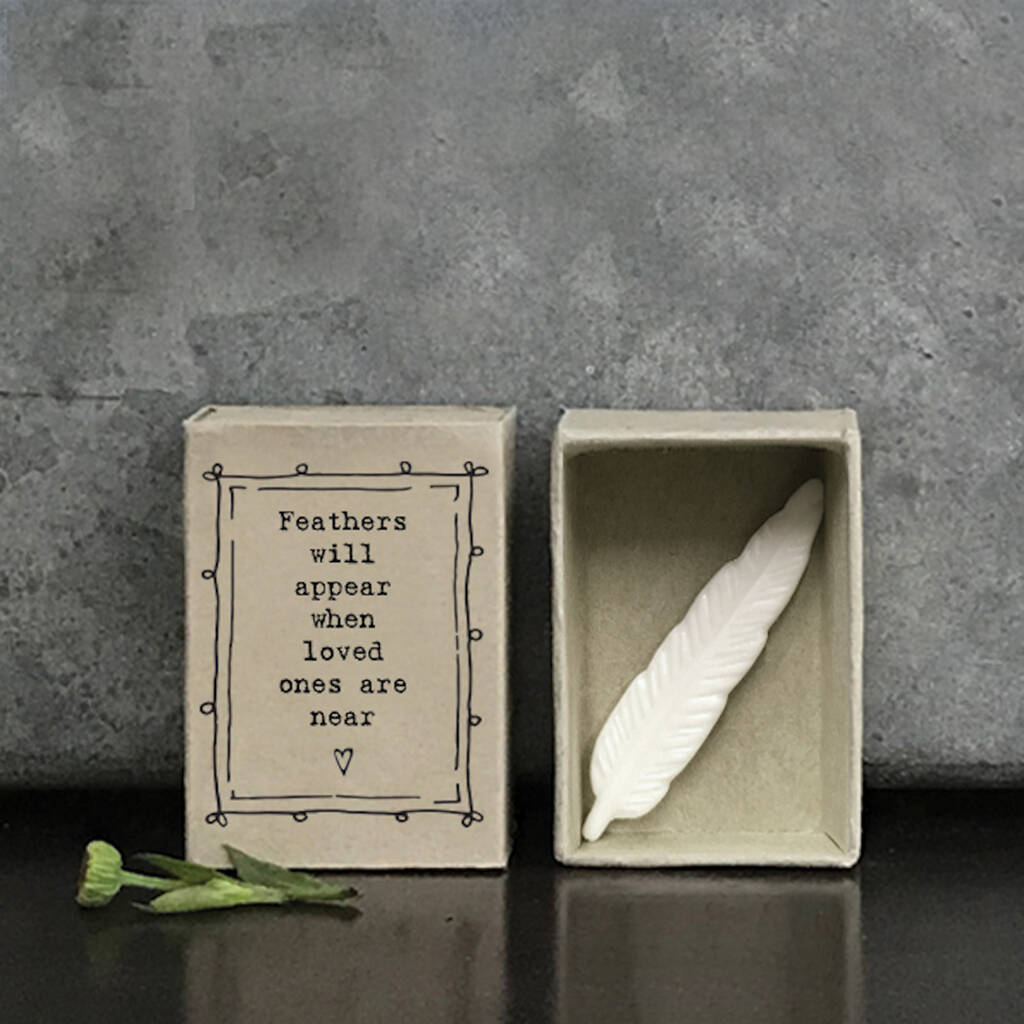 East Of India Porcelain Feather Ornament In Matchbox Loved Ones Are Near