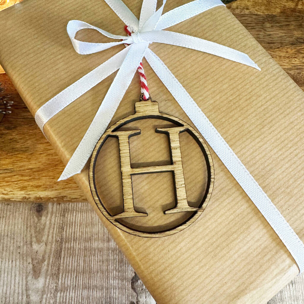 Personalised Oak Veneer Initial Christmas Bauble Gift Wrapping