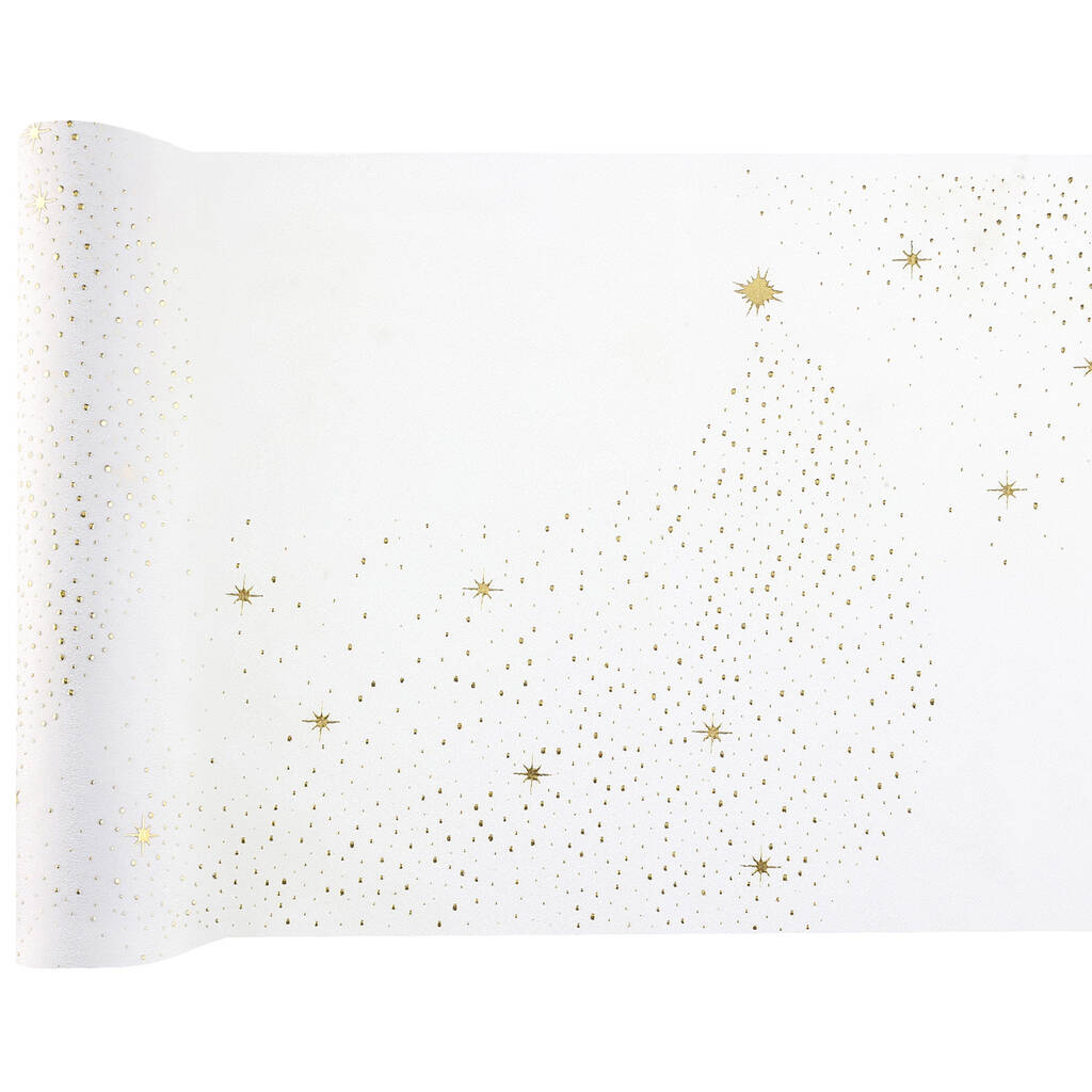 Crafted from high-quality polyester crepe, this elegant runner adds a touch of sparkle and sophistication to your holiday decor.