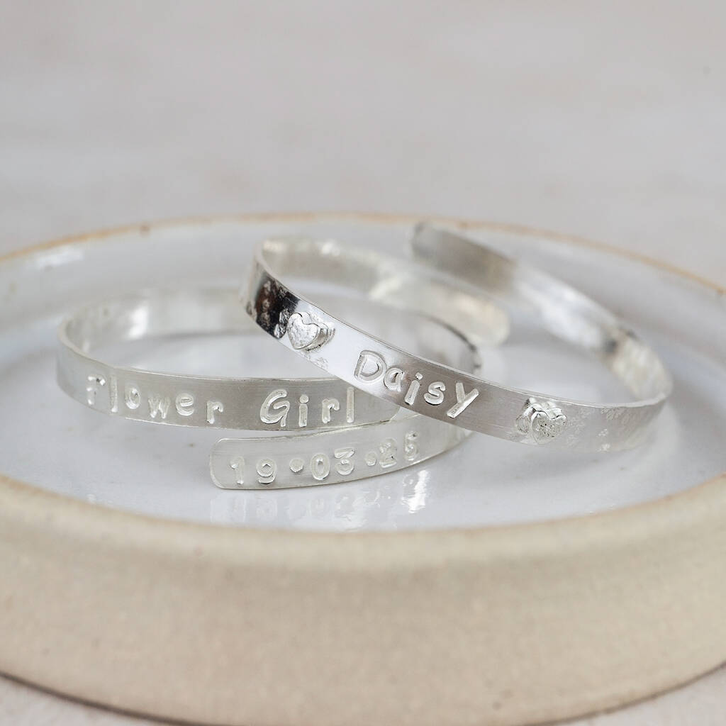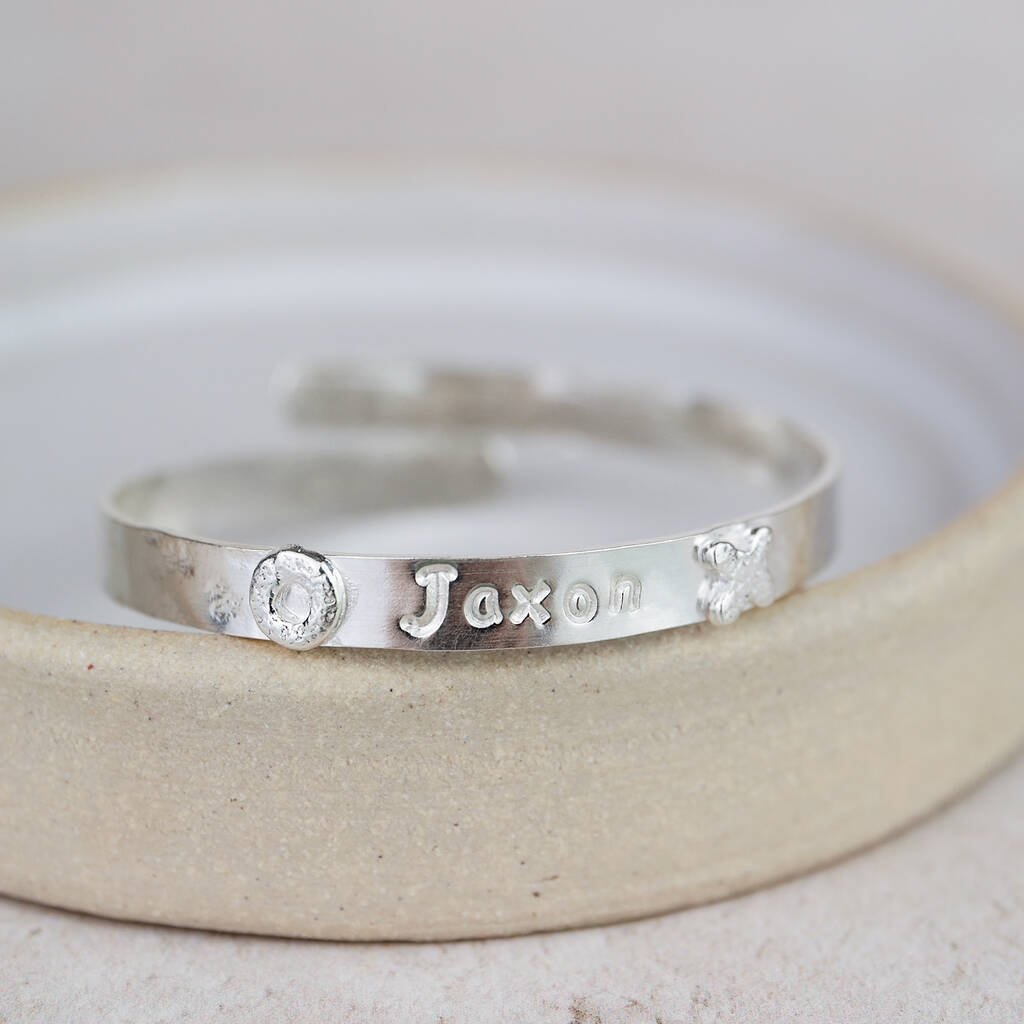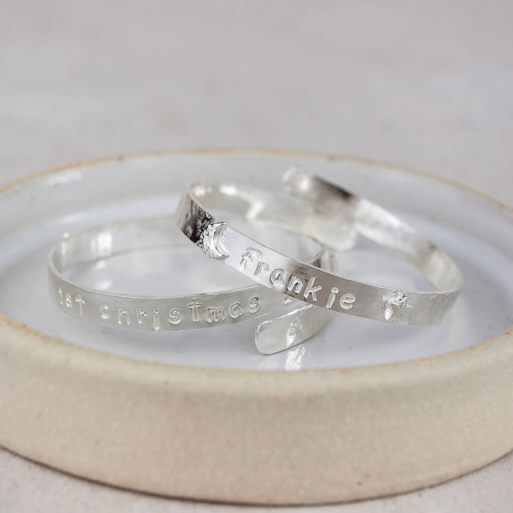 Handmade sterling silver personalised christening bangle.