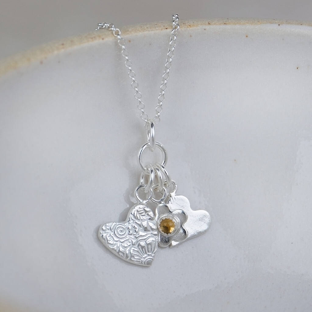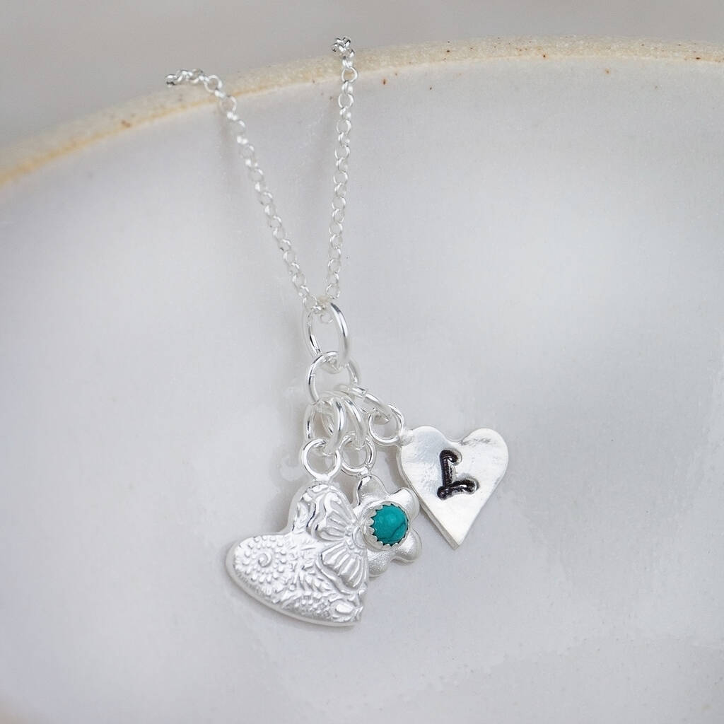 Handmade sterling silver birthstone cluster necklace. Make this item even more special by personalising the heart with an initial of your choice.