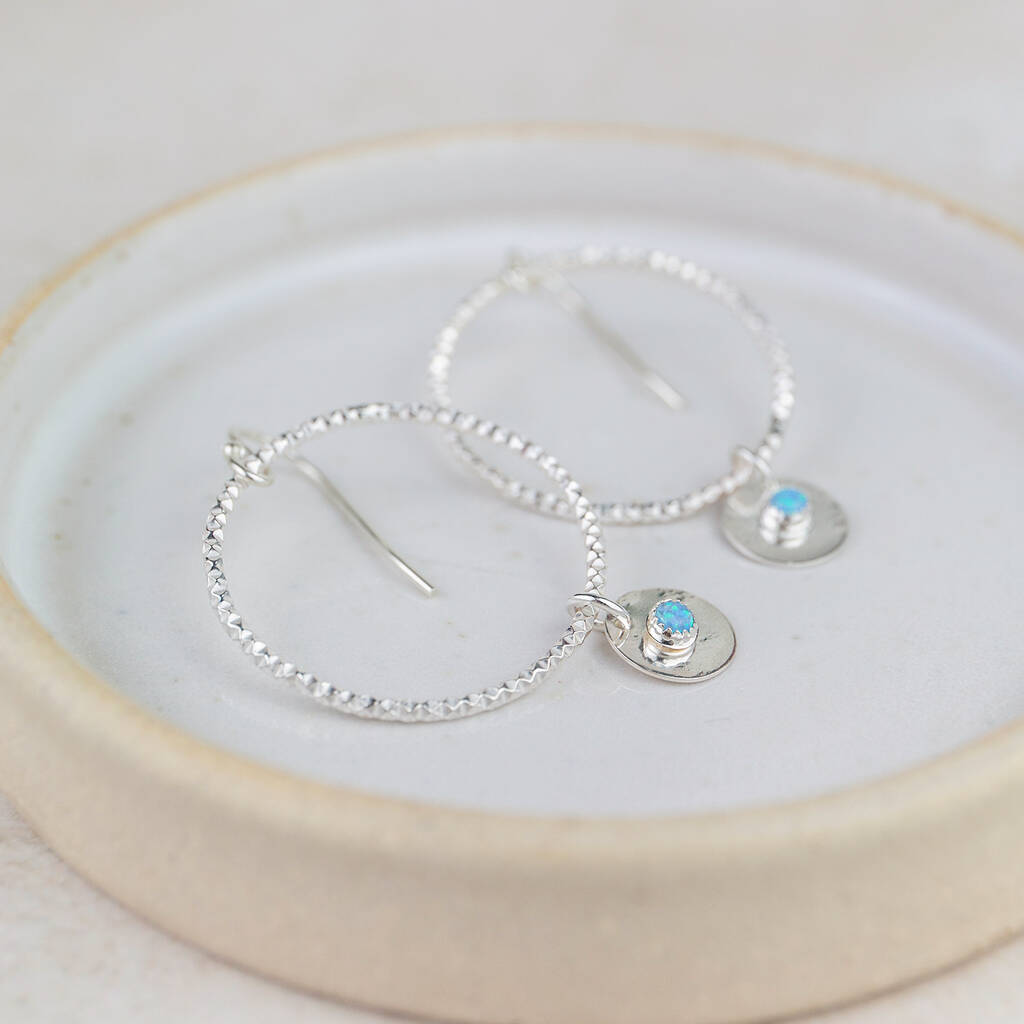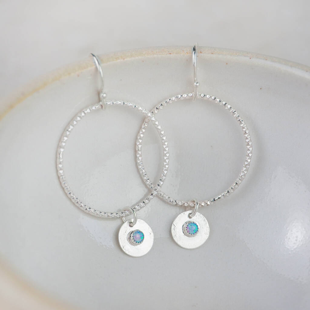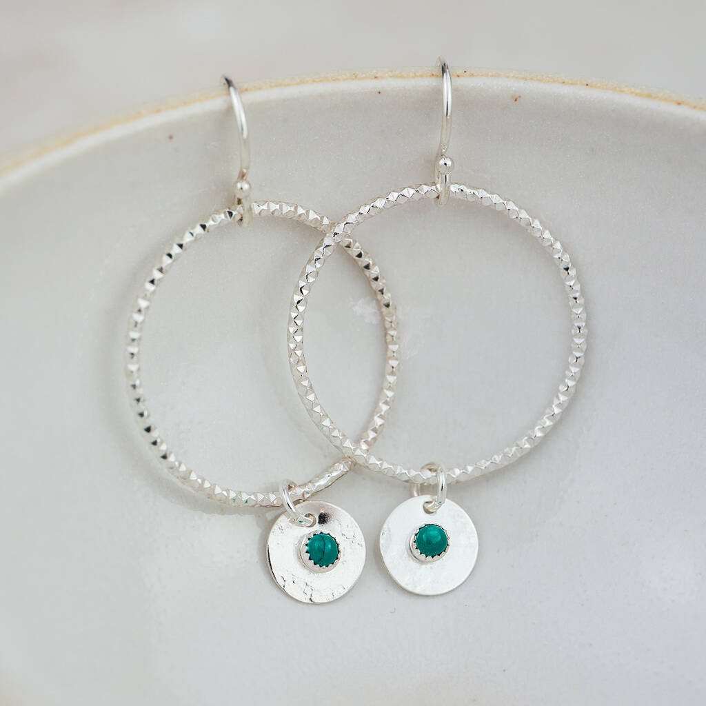 These stunning Sterling Silver Boho Earrings are handmade with a faceted 2.5cm diamete hoop, that features a circle setting with a 3mm set semi precious stone.
