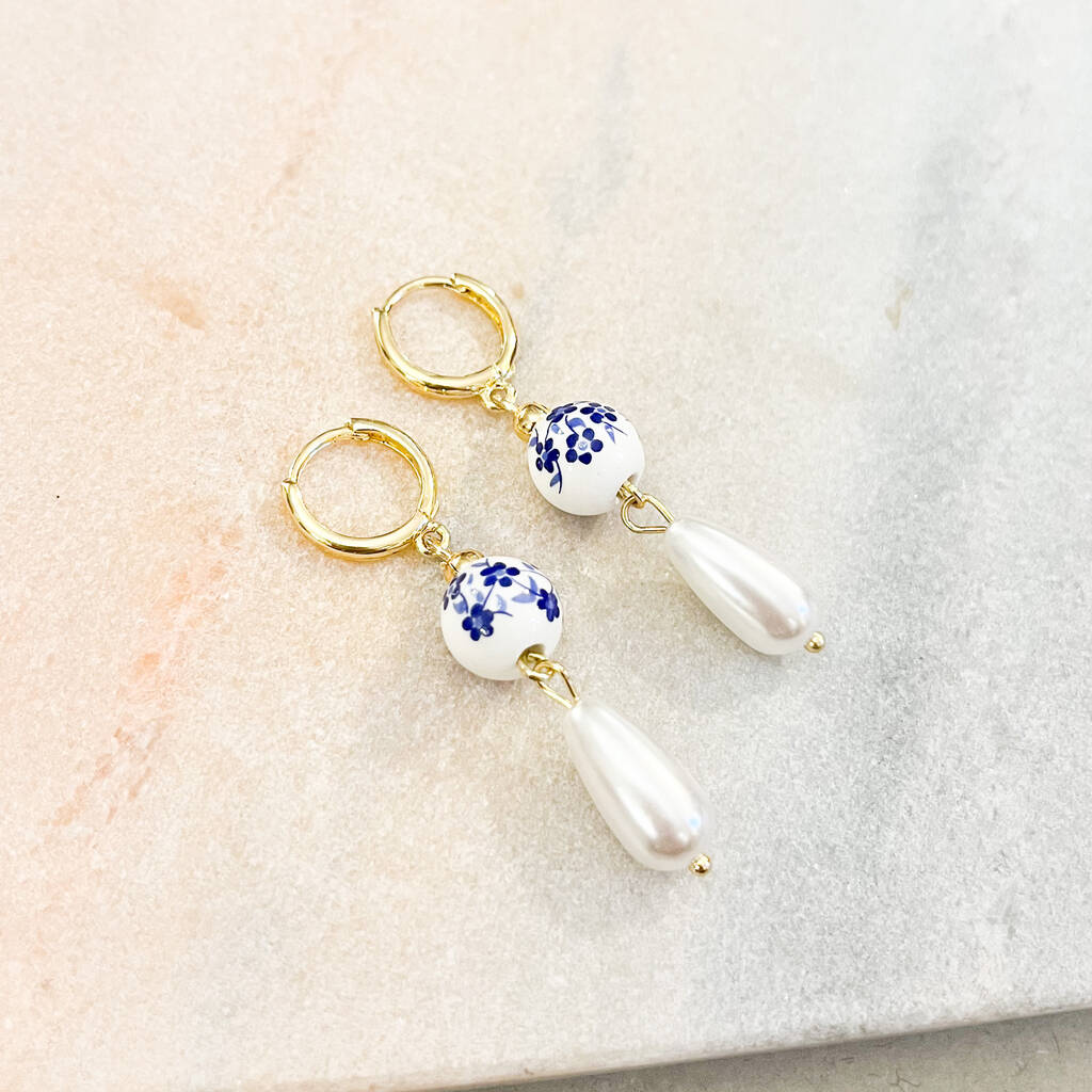 Blue Floral Ceramic Bead And Teardrop Pearl Drop Earrings