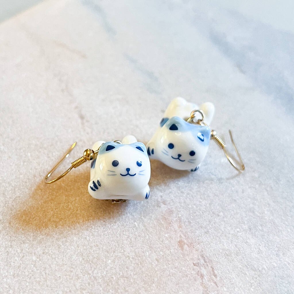 Ceramic Blue Spotted Lucky Cat Drop Earrings