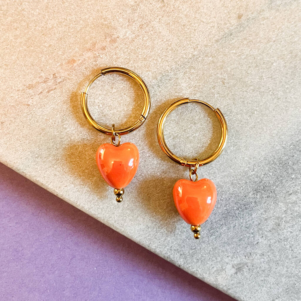 Chunky Gold Hoop Earrings With Glazed Orange Heart Charms
