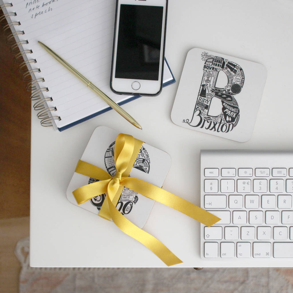 A durable melamine coaster with an intricately detailed letter filled with all your favourite things from your own pocket of London.