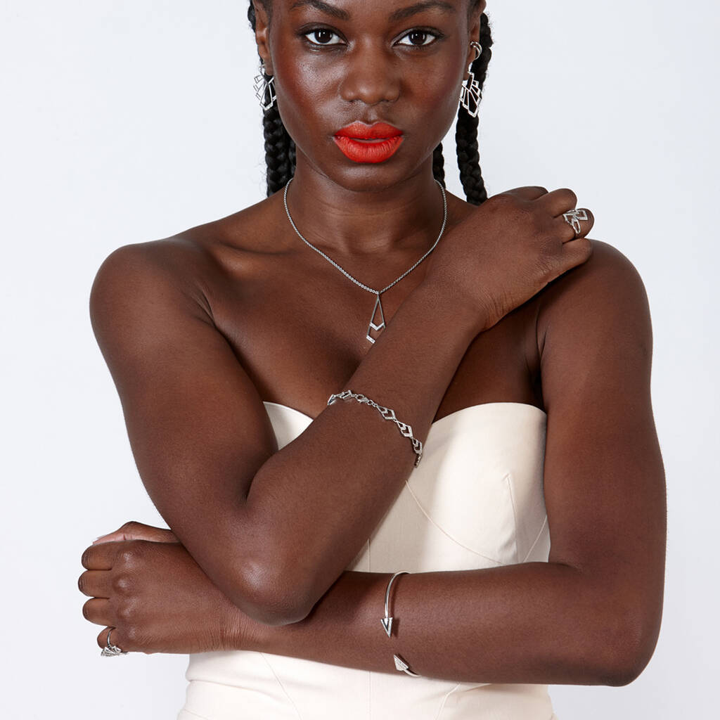 ► Handcrafted from 925 sterling silver with rhodium overlay ► Set with white topaz gemstones ► 11 geometric links, each 1.75cm × 1cm ► Adjustable 8-inch length with trigger clasp ► Weight: 10.7g ► Hallmarked in Sheffield, UK ► Presented in a Lucy Quartermaine designer gift box