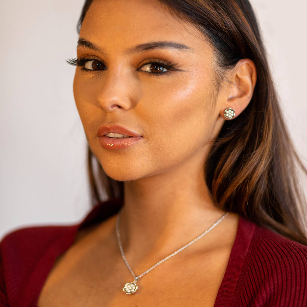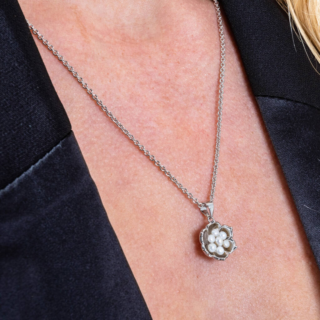 This delicate Pearl Flower Pendant captures the beauty of the Lily of the Valley, a favourite motif of the late Queen and a symbol of purity and renewal. Handcrafted from 925 sterling silver with a rhodium overlay and set with luminous freshwater pearls, it embodies the elegance of nature and heritage craftsmanship. Perfect for everyday wear or as a meaningful gift.