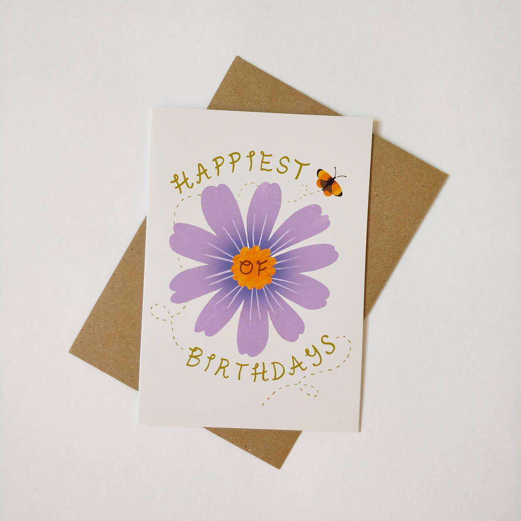 Illustrated by Lucy Scott, this card features a colourful Aster flower with an inquisitive butterfly gently trailing around it.