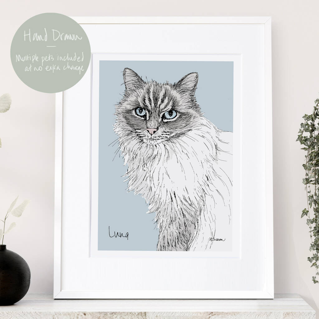 Lucy will draw your cat(s) by hand as a line drawing in our Derbyshire Dales studio. She'll add your text in the font of your choice, and your choice of coloured background. She can draw upto 5 pets together from the same or separate photos. You can mix cats and dogs if you like.