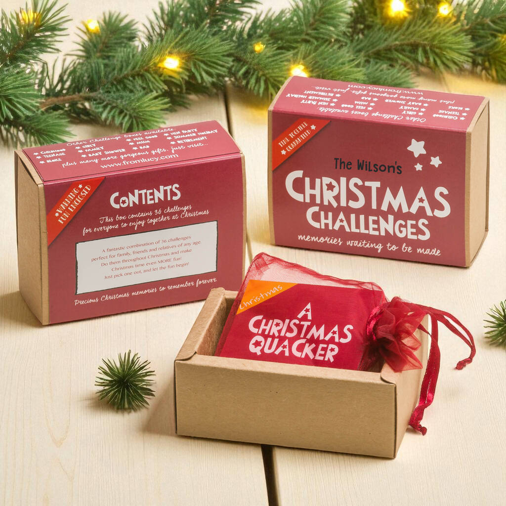 The box can be personalised with the name of the recipient by adding a name above the title 'Christmas Challenges'. This would then read for eg: The Smiths' Christmas Challenges, Freddie's Christmas Challenges, or Wilson Christmas Challenges) to make it a unique and unforgettable gift.