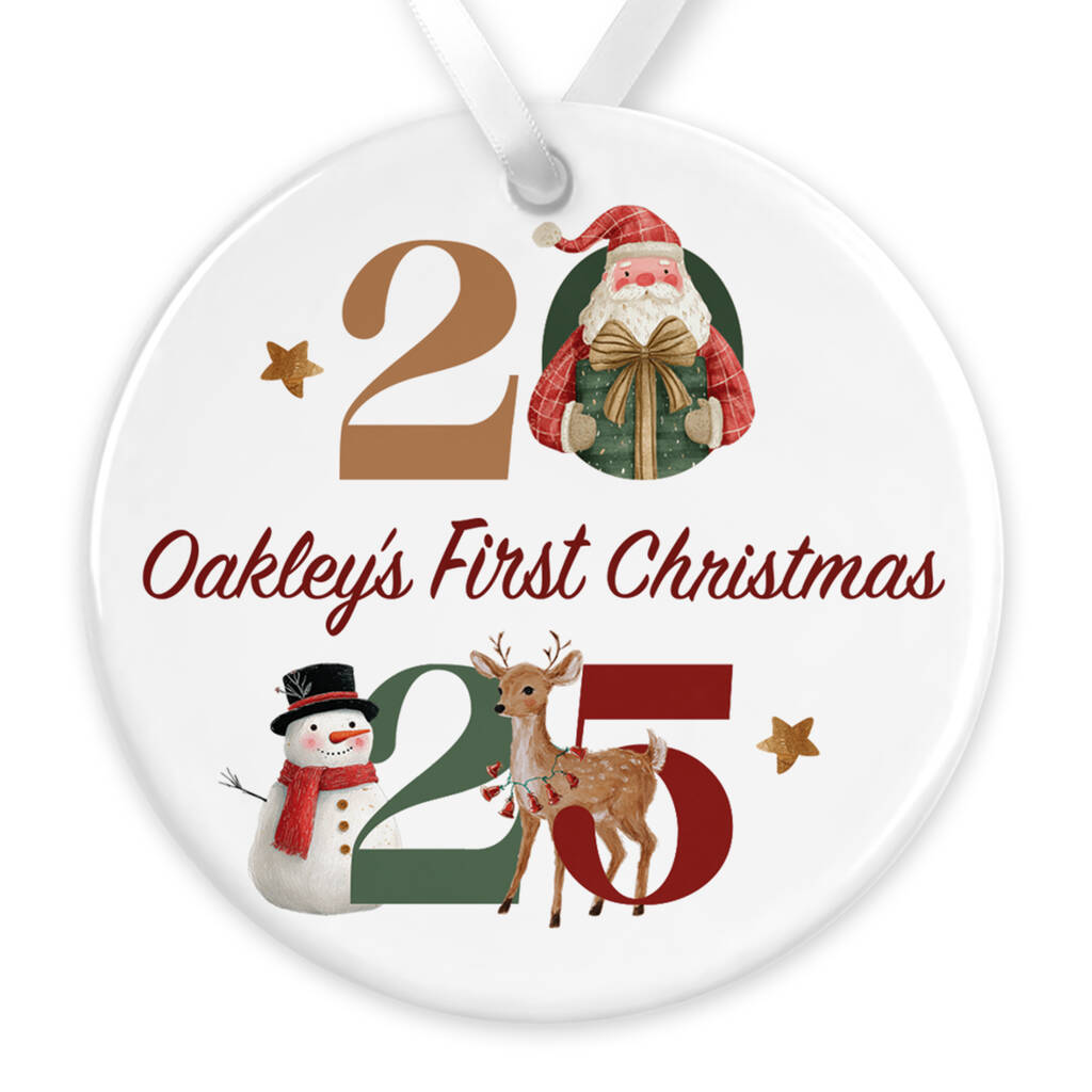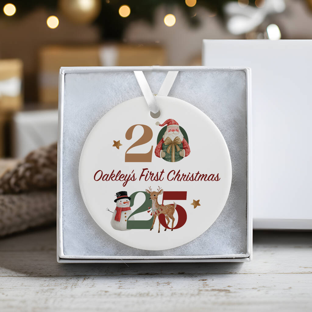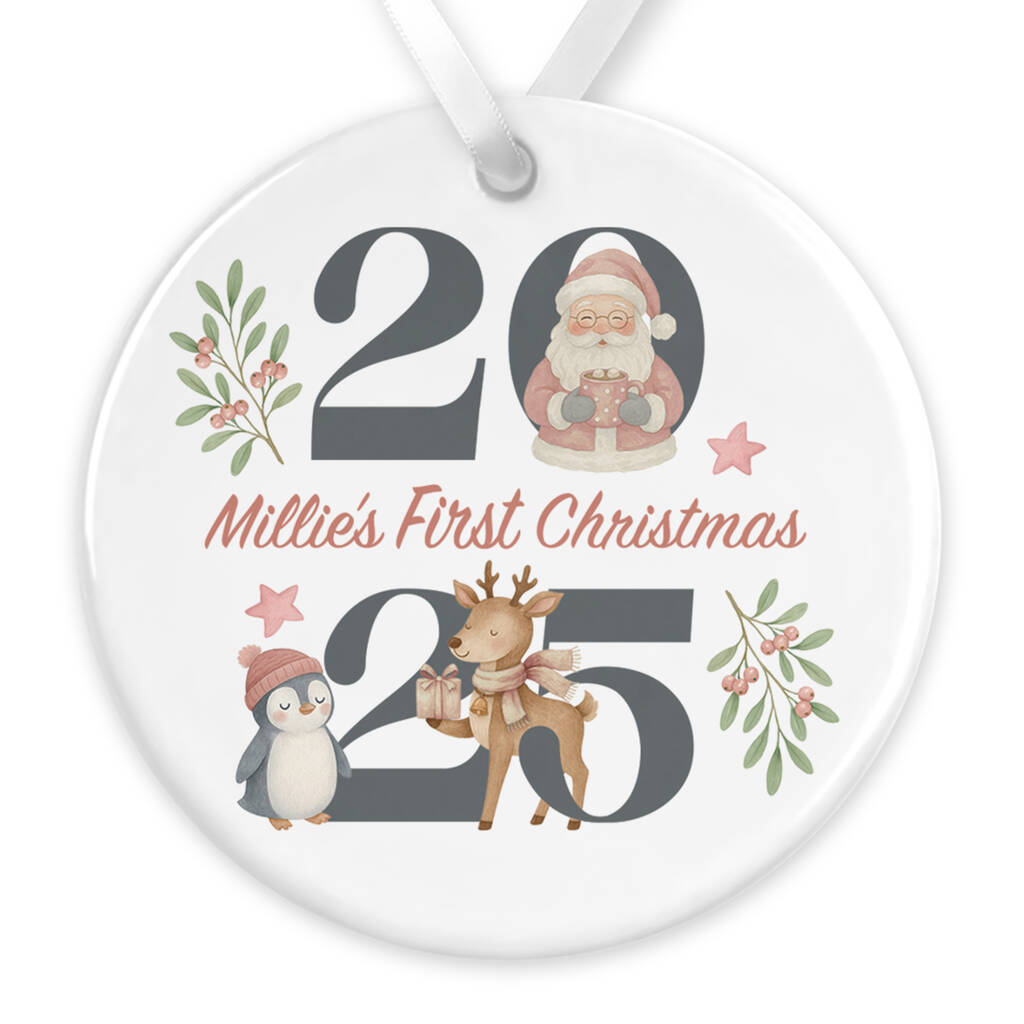 Personalised 2025 Baby's First Christmas Ceramic Bauble In Red, Pink Or Blue