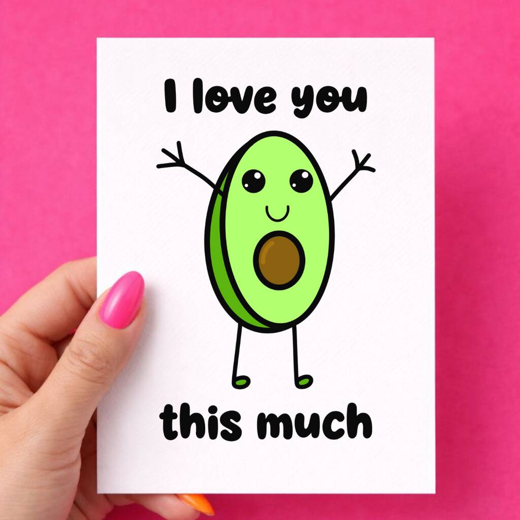 Cute Valentine’s Day A6 avocado card “I Love You This Much” printed on premium 300gsm card.