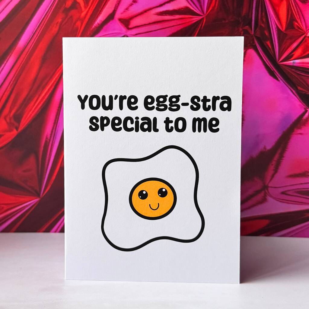 Funny Valentine’s Day A6 card “You’re Eggstra Special To Me” printed on premium 300gsm card.