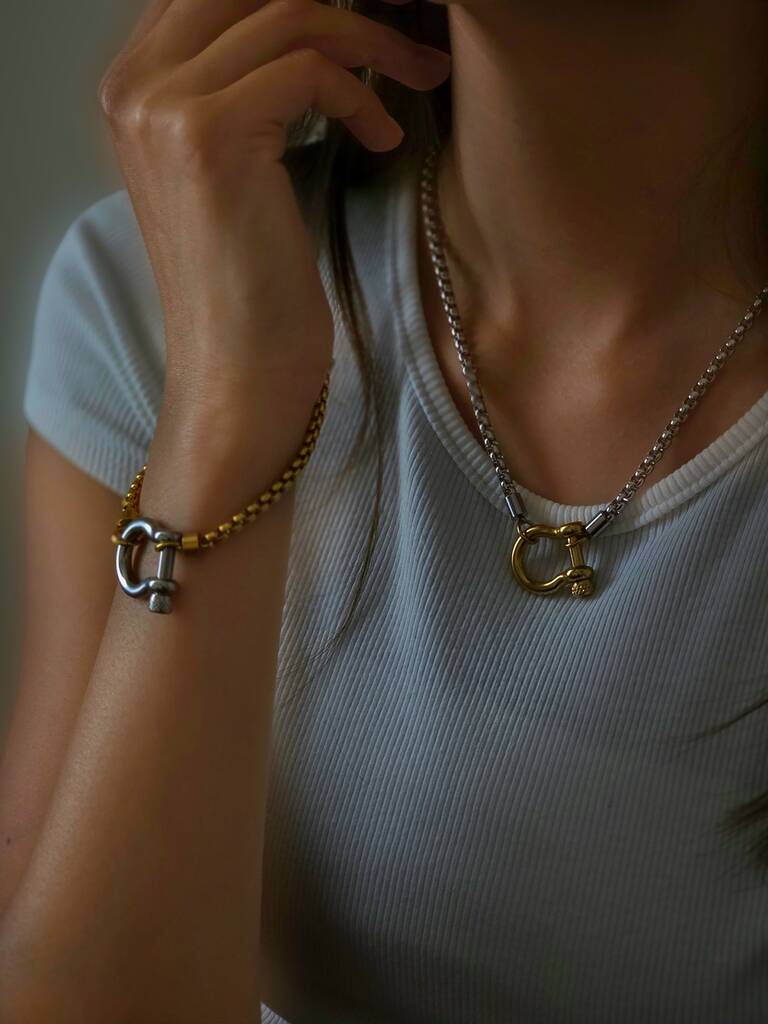 A fusion of strength and style — our Chunky Shackle Chain Bracelet brings a sleek industrial edge to your jewellery collection. Designed with a solid stainless-steel chain and a statement shackle clasp, this Bracelet makes a confident statement while staying effortlessly wearable. MATCHING NECKLACE available.