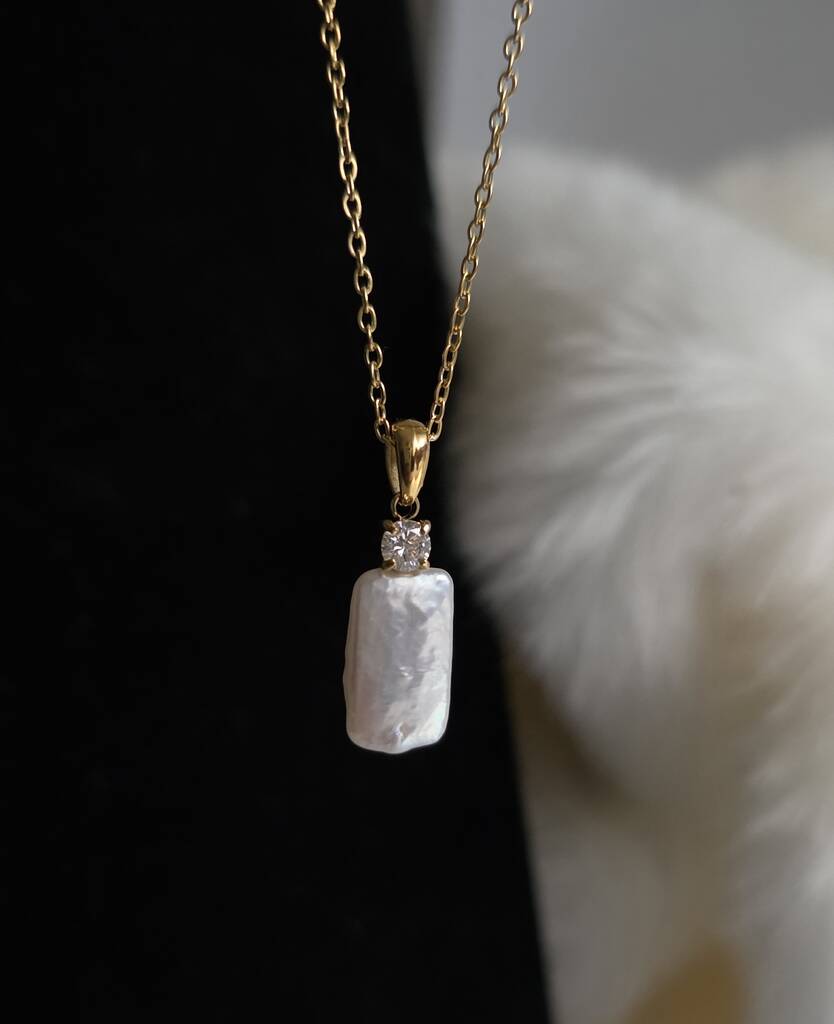 Round Cz And Rectangular Baroque Freshwater Pearl Pendant 18k Gold Tarnishfree Adjustable Necklace
