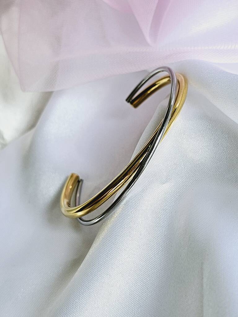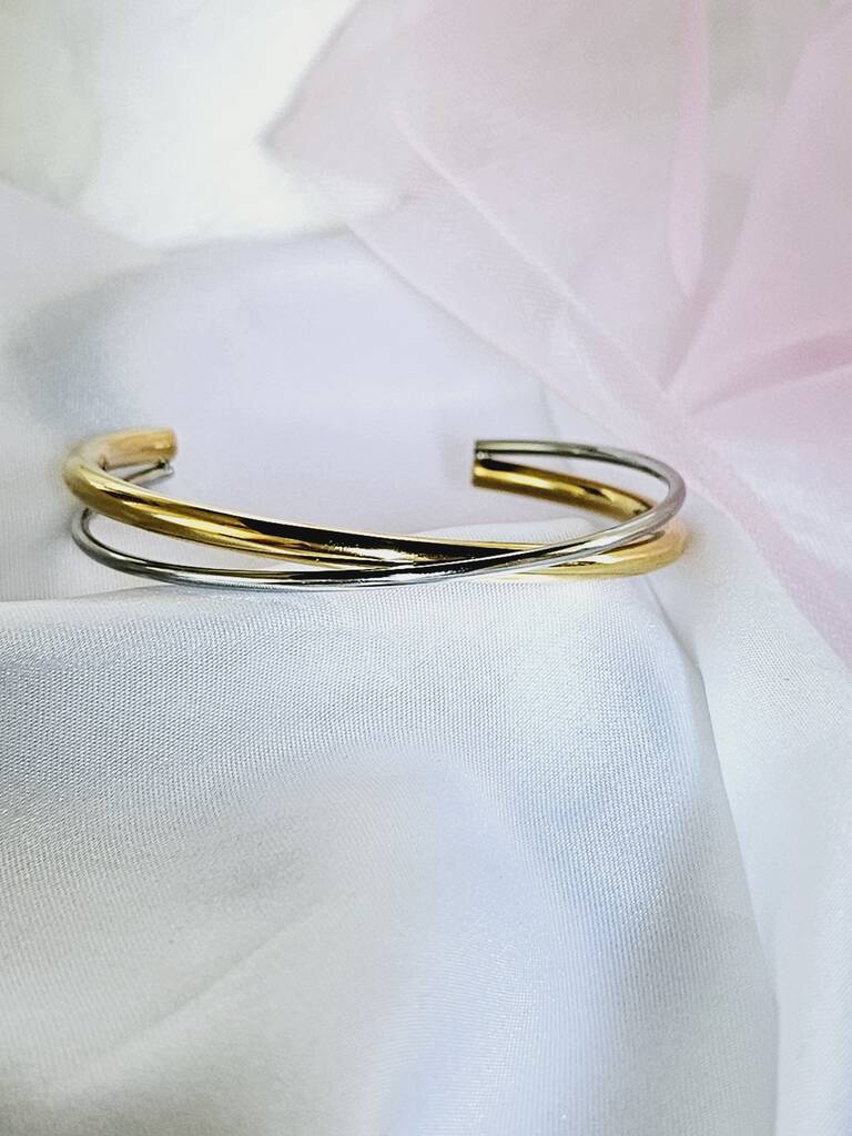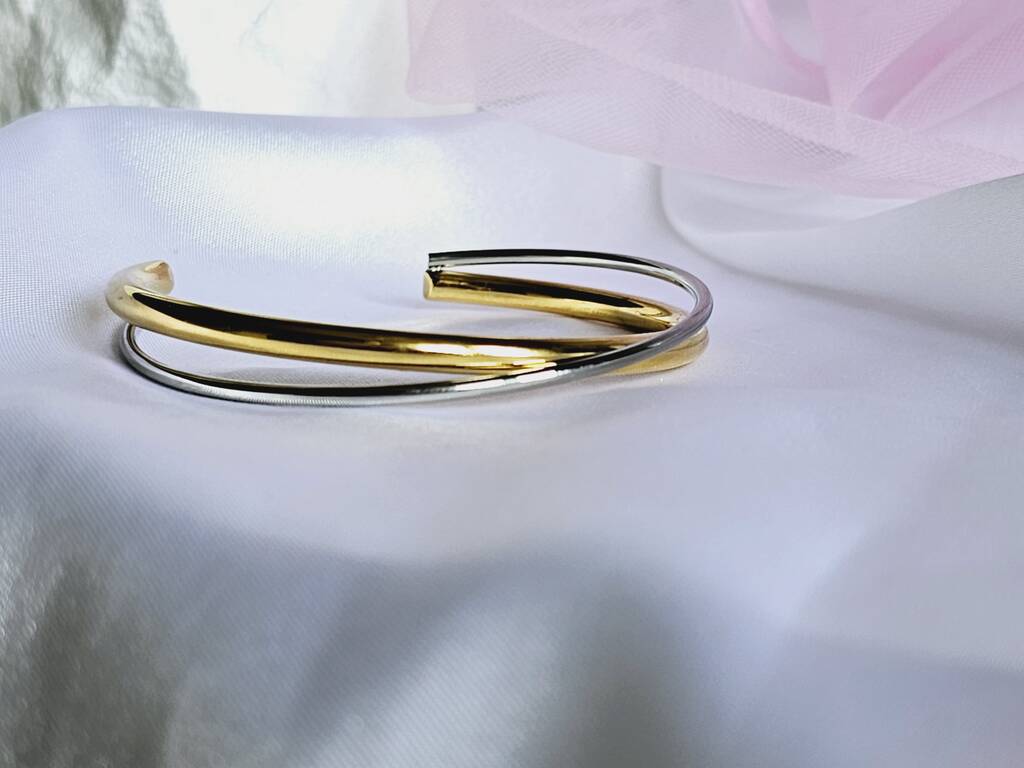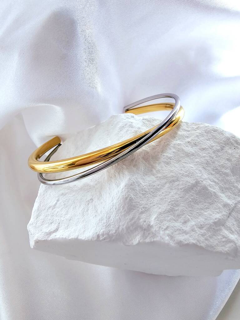 A sleek two-tone open cuff bangle with 18K gold and silver plating over hypoallergenic stainless steel, designed for effortless everyday elegance.