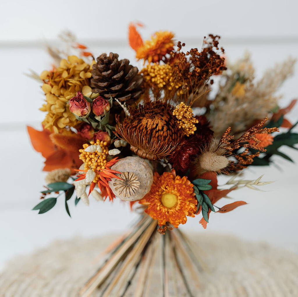 This bouquet features a rich palette of burnt orange and mustard tones, blending fluffy pampas grass, preserved eucalyptus, rust strawflowers, pine cones, and hydrangeas for a naturally textured, autumn-inspired display.