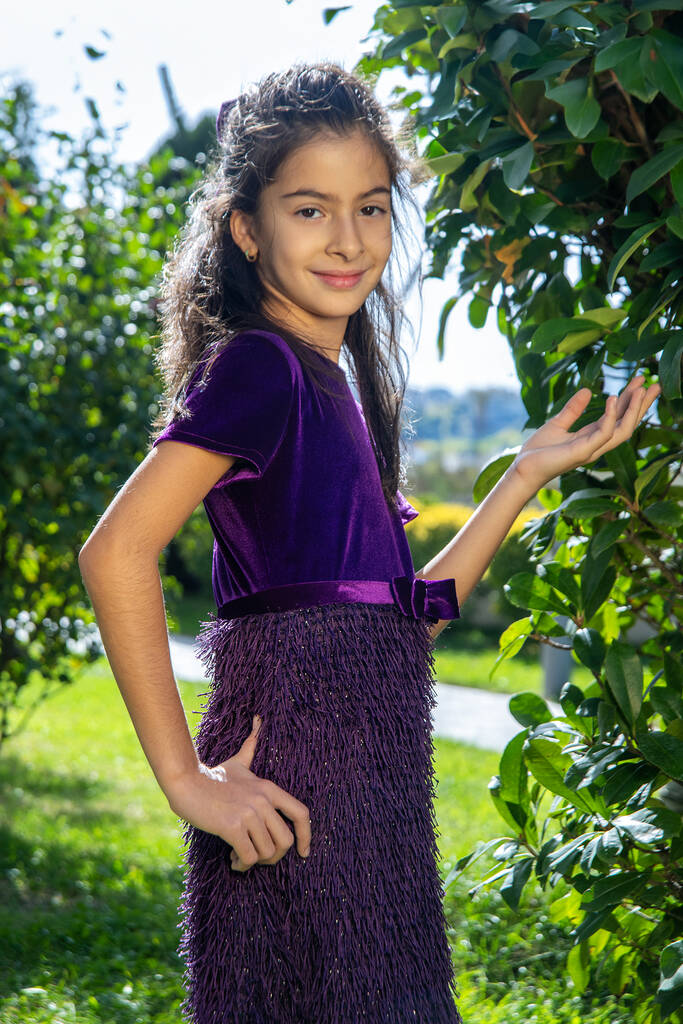 Statement velvet-look dress with textured skirt and matching hair clip.The Alessia Dress with Hair Clip Accessory is designed for girls who love to shine at special occasions. In a bold purple hue, this dress features a soft velvet-effect bodice paired with a textured skirt for added movement and charm. Crafted from a polyester and elastane blend, it provides both stretch and comfort while offering a luxurious finish. Ideal for birthdays, weddings, festive gatherings, or parties, Alessia combines playful elegance with practicality. A matching hair clip completes the coordinated look. Available in sizes 3 to 10 years, it makes a stylish and thoughtful gift for little fashion lovers.
