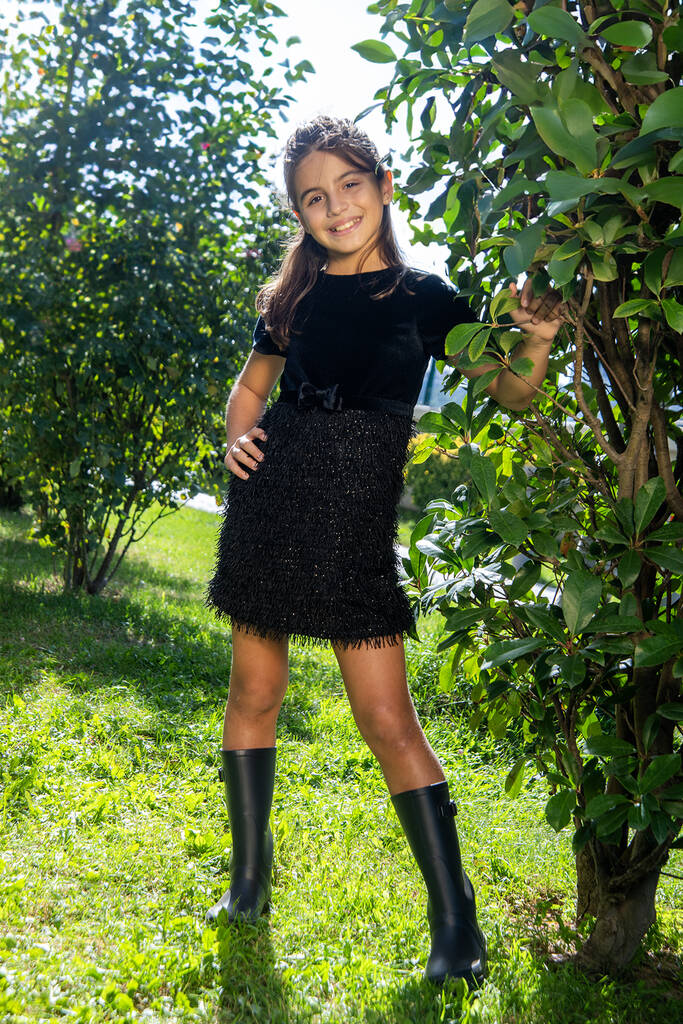 Chic velvet-look dress with textured skirt and matching hair clip.The Isabella Dress with Hair Clip Accessory is a sophisticated outfit for girls who love timeless style. In classic black, this dress combines a soft velvet-effect bodice with a textured skirt that adds movement and flair. Made from a blend of polyester and elastane, it provides gentle stretch for comfort while maintaining an elegant silhouette. Perfect for birthdays, weddings, festive gatherings, or special parties, Isabella is a versatile piece that pairs easily with tights or boots. The matching hair clip completes the polished look. Available in sizes 3 to 10 years, it makes a stylish and thoughtful gift.