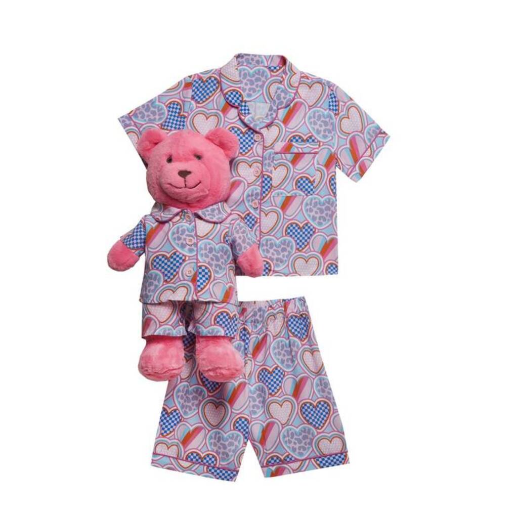 A playful cotton pyjama set with a matching teddy bear, perfect for girls who love comfort, colour, and the joy of a bedtime companion.The Lia Pyjama Set brings bedtime fun to life with its colourful heart-print design and matching teddy bear companion. Made from 100% premium cotton, these short-sleeve pyjamas are breathable and comfortable for a restful night’s sleep. Each set includes a cuddly teddy bear dressed in the same fabric, creating a delightful bedtime ritual. With high-quality finishes and attention to detail, the Lia set is both practical and playful. Beautifully packaged in a gift box, it’s a perfect present for birthdays, holidays, or simply to make bedtime more magical.