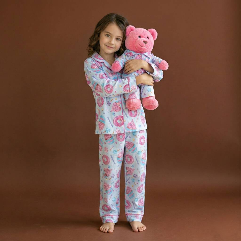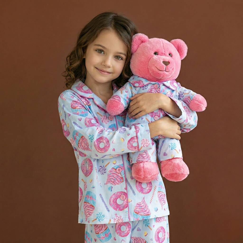 A sweet cotton pyjama set with a matching teddy bear, designed for comfort and charm—perfect for cosy nights and imaginative play.