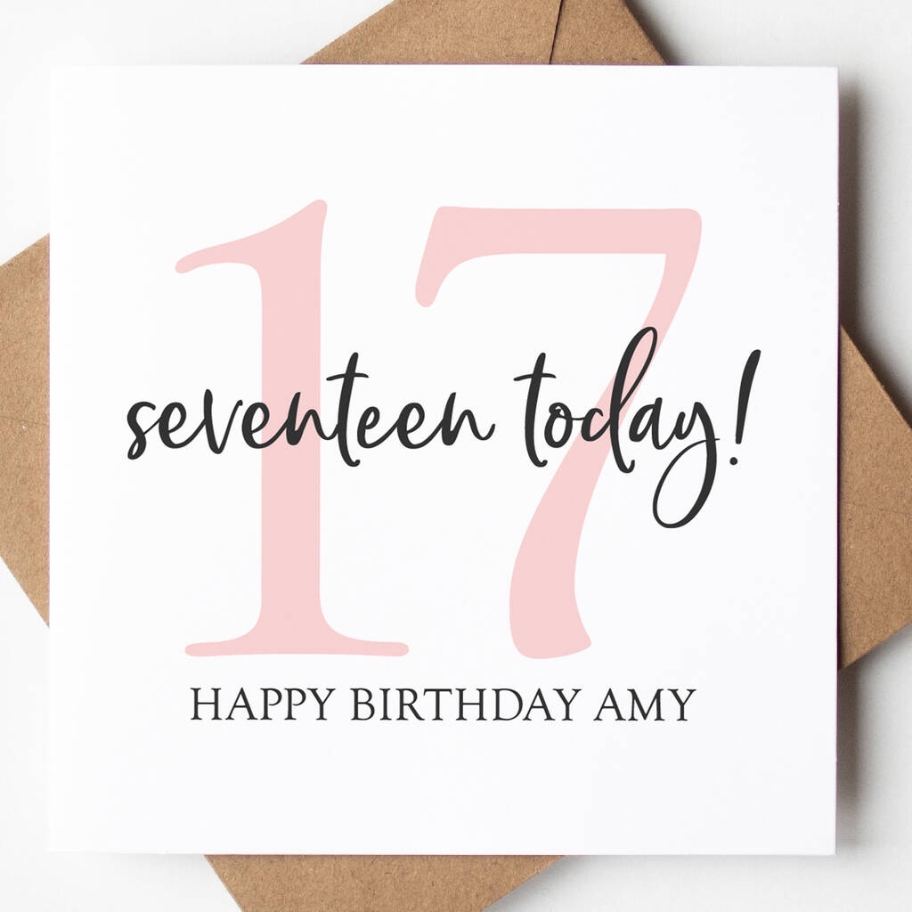 Mark a milestone with this stylish personalised birthday card, perfect for tweens and teens aged 11 to 17. Featuring a soft pink number in a modern serif font and ‘seventeen today!’ (or your chosen age) in elegant script, it’s a simple yet striking design. Add their name for a thoughtful finishing touch that makes the card extra special.