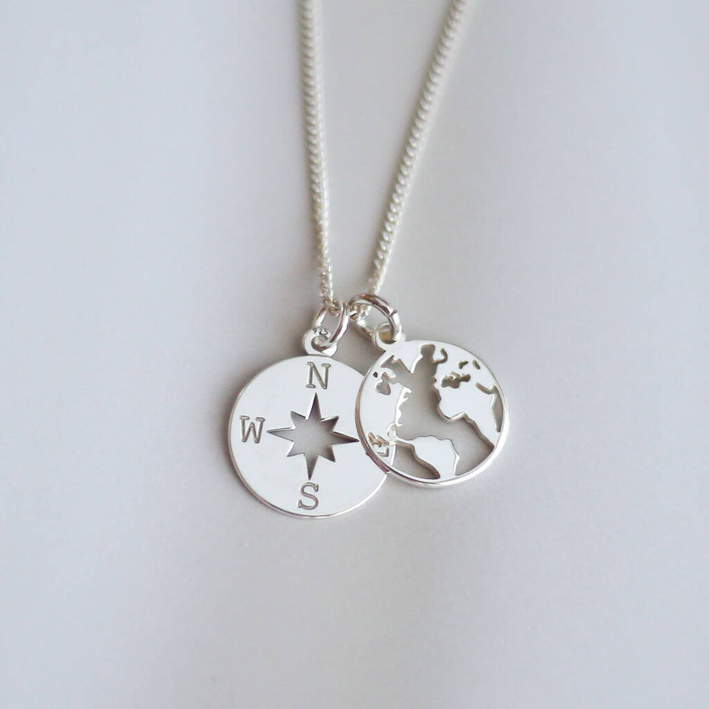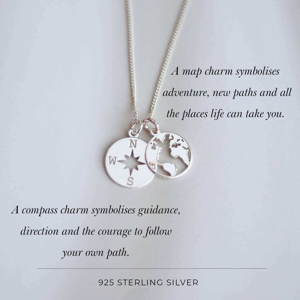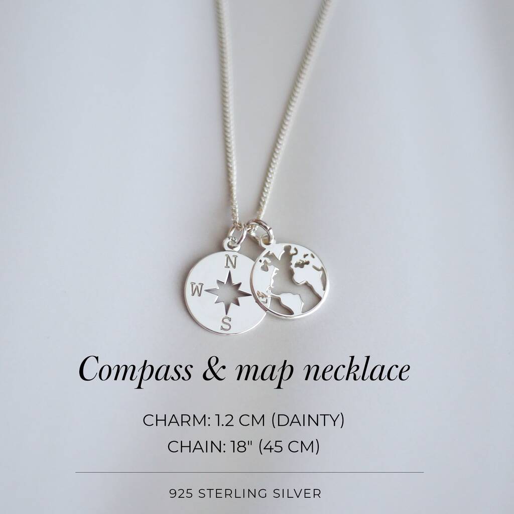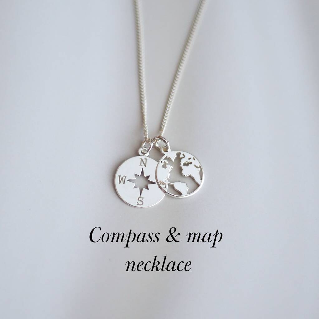 A dainty sterling silver map and compass necklace, with optional birthstone or initial disc - a meaningful gift for adventurers and frequent travellers.