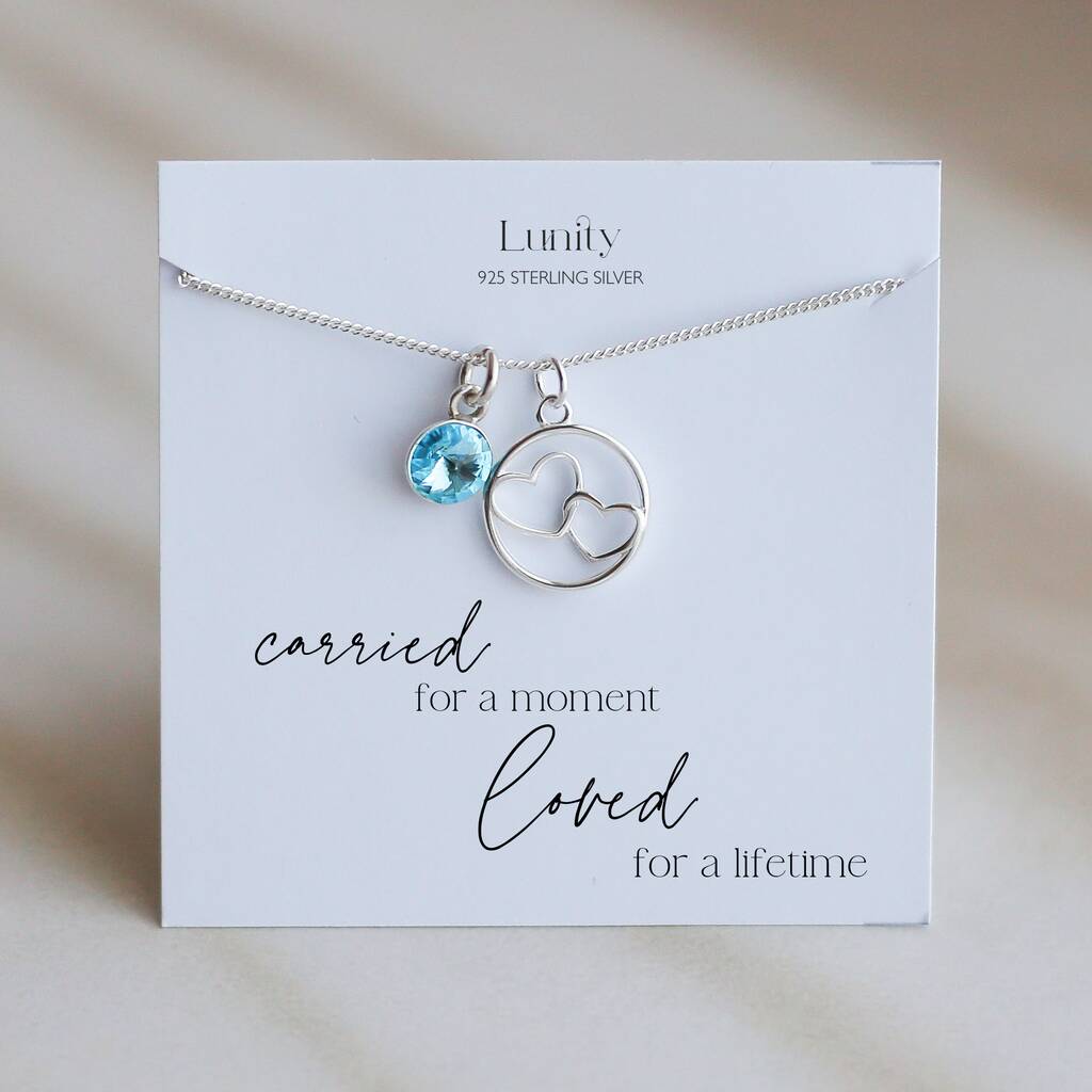 A double-heart necklace with a remembrance card – a gentle tribute to a little life carried for a moment and loved for a lifetime.