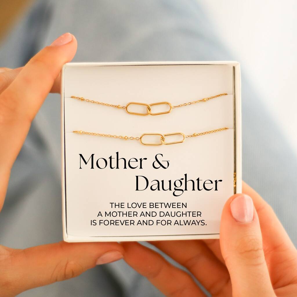 This set of two bracelets features interlocking rectangular links, symbolising a bond that stays strong through every chapter of life. Simple yet full of meaning, each bracelet represents love, support, and the connection shared between a mother and her daughter.