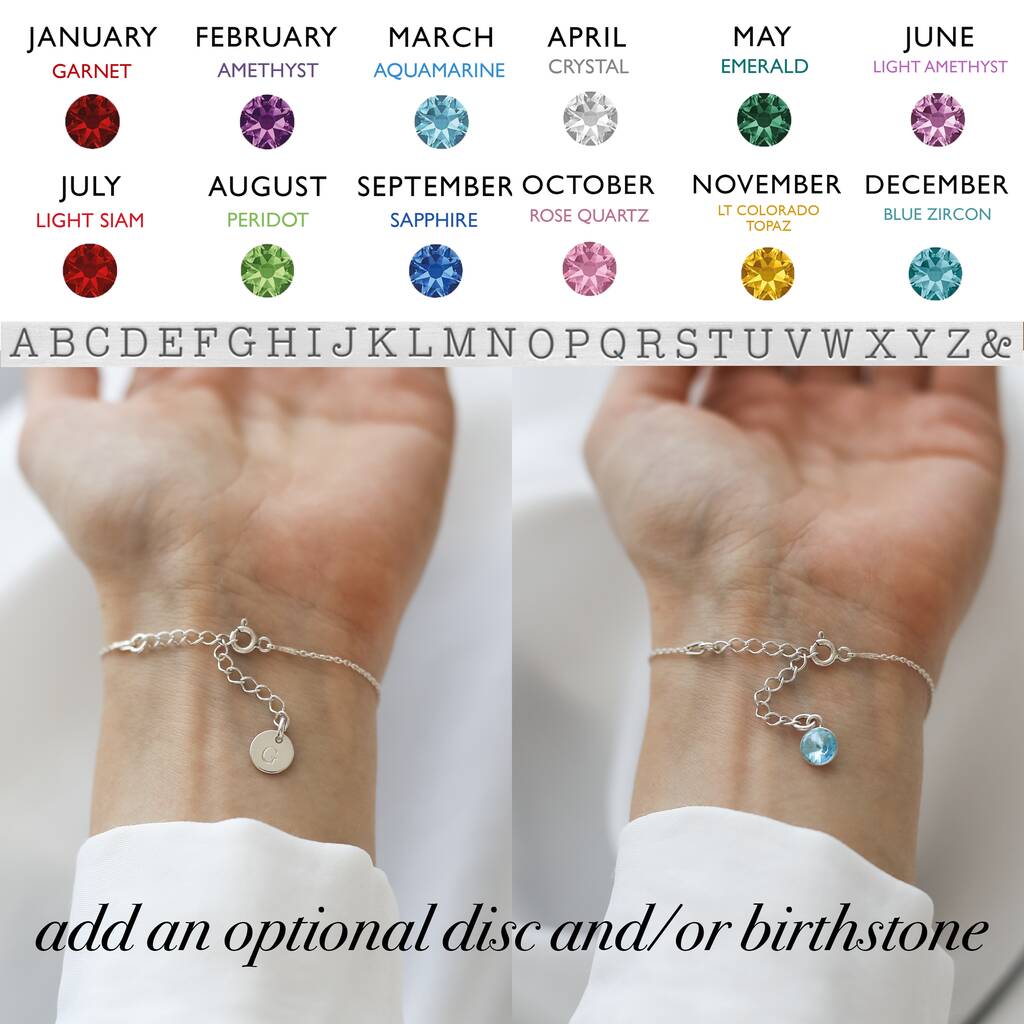 • Optional initial disc (0.8 cm) or birthstone charm (0.6 cm)