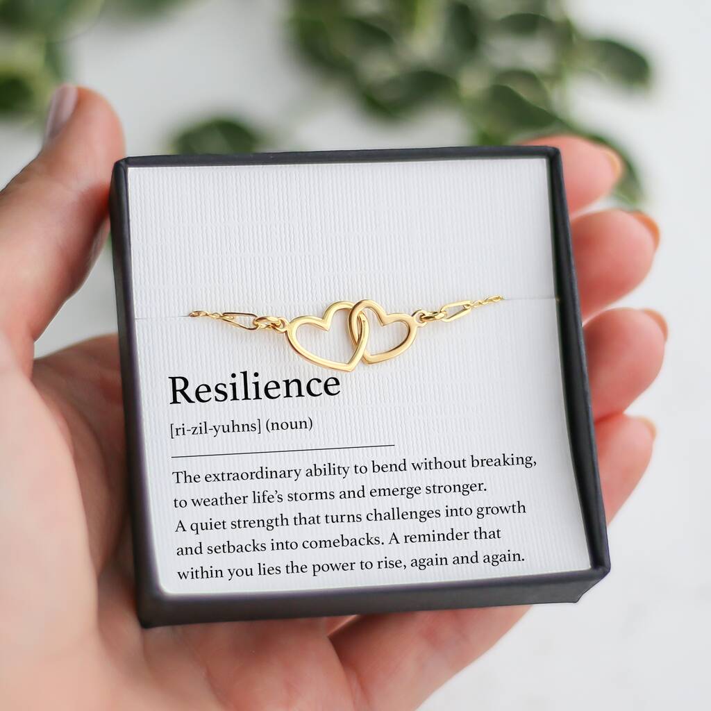 A delicate two hearts bracelet with the Resilience card – a symbol of strength, courage, and the power to keep going.