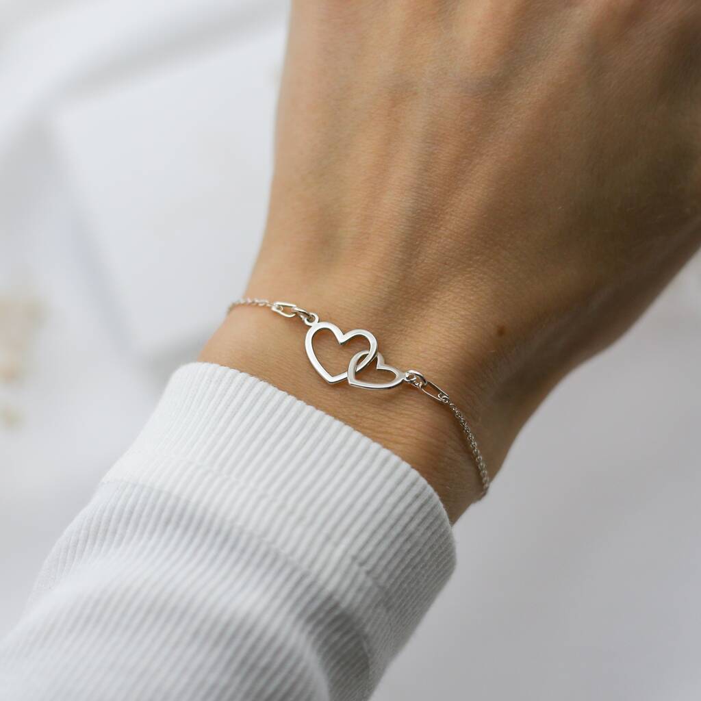 This elegant bracelet features two interlocking hearts, representing courage, love, and the unbreakable strength found in connection.A meaningful gift for birthdays, Christmas, or to uplift someone going through a challenging time.Handmade in our Norwich studio from high-quality materials, it arrives in a gift box and can be personalised with an initial disc or birthstone charm added at the end of the extension chain.
