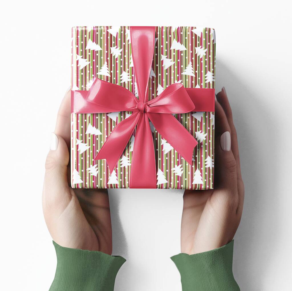 Wrap your Christmas gifts in sheer luxury with our red and green pin stripe design with snowflakes and trees silhouettes, crafted from a sumptuous 140gsm thick paper, this premium wrapping material exudes sophistication and ensures your presents stand out, crafted to perfection, this premium wrapping paper exudes sophistication and luxury, making it the perfect choice for any special occasion.