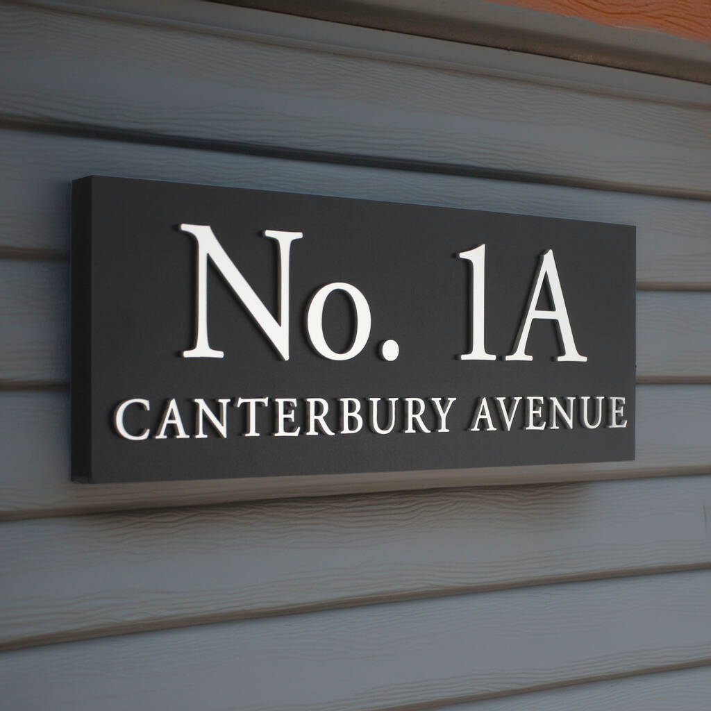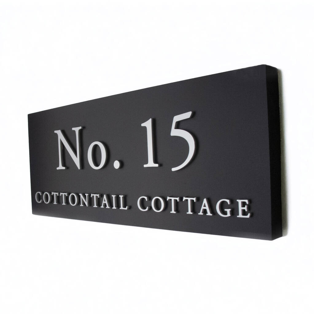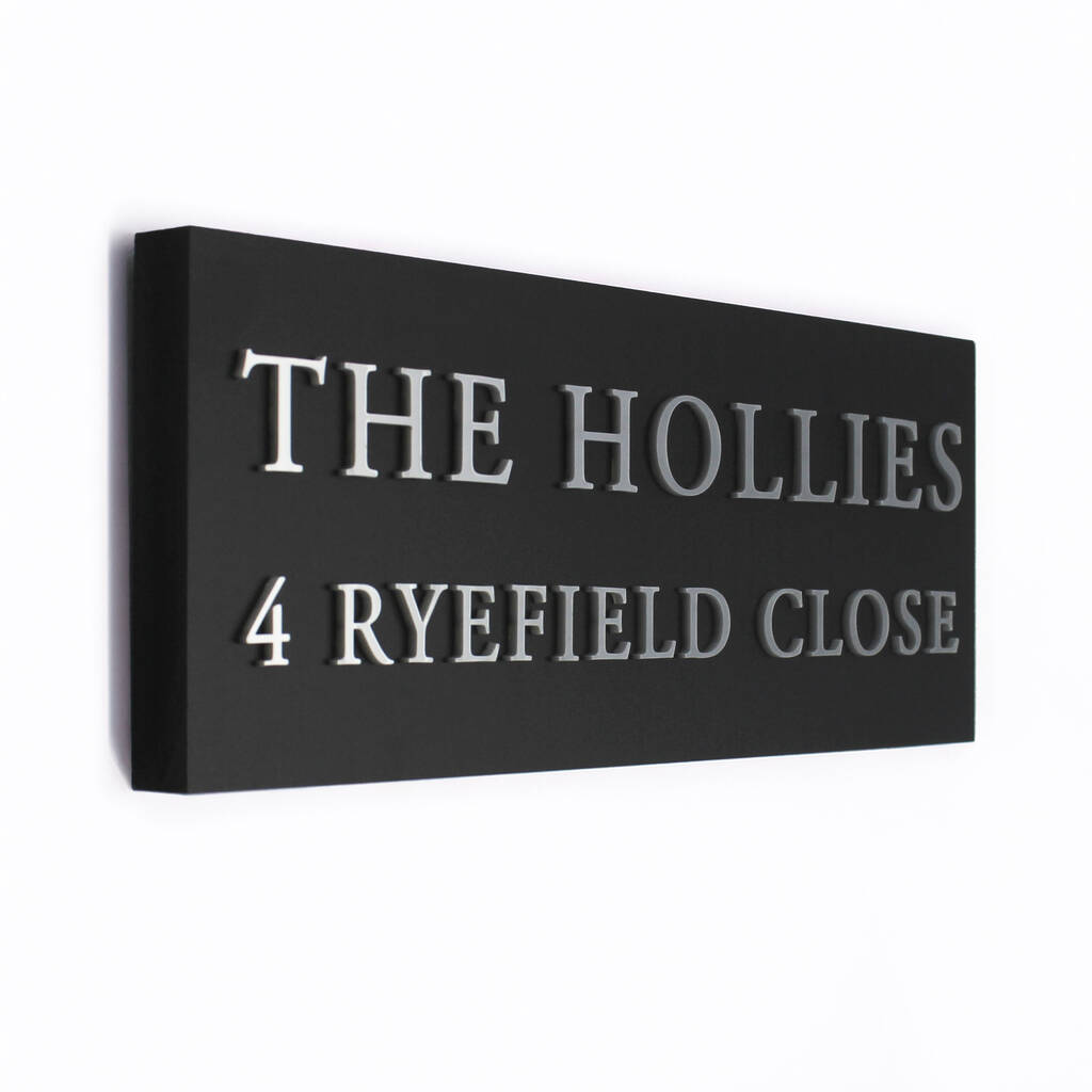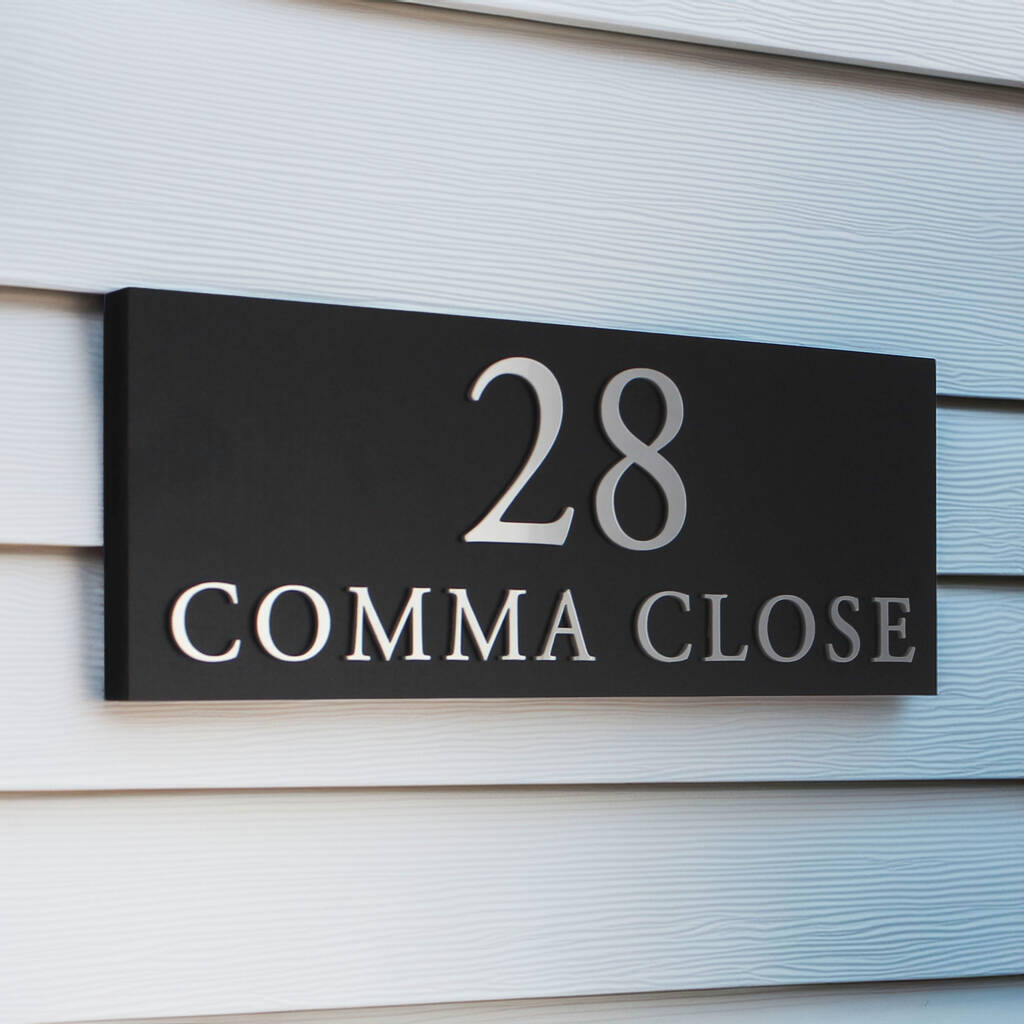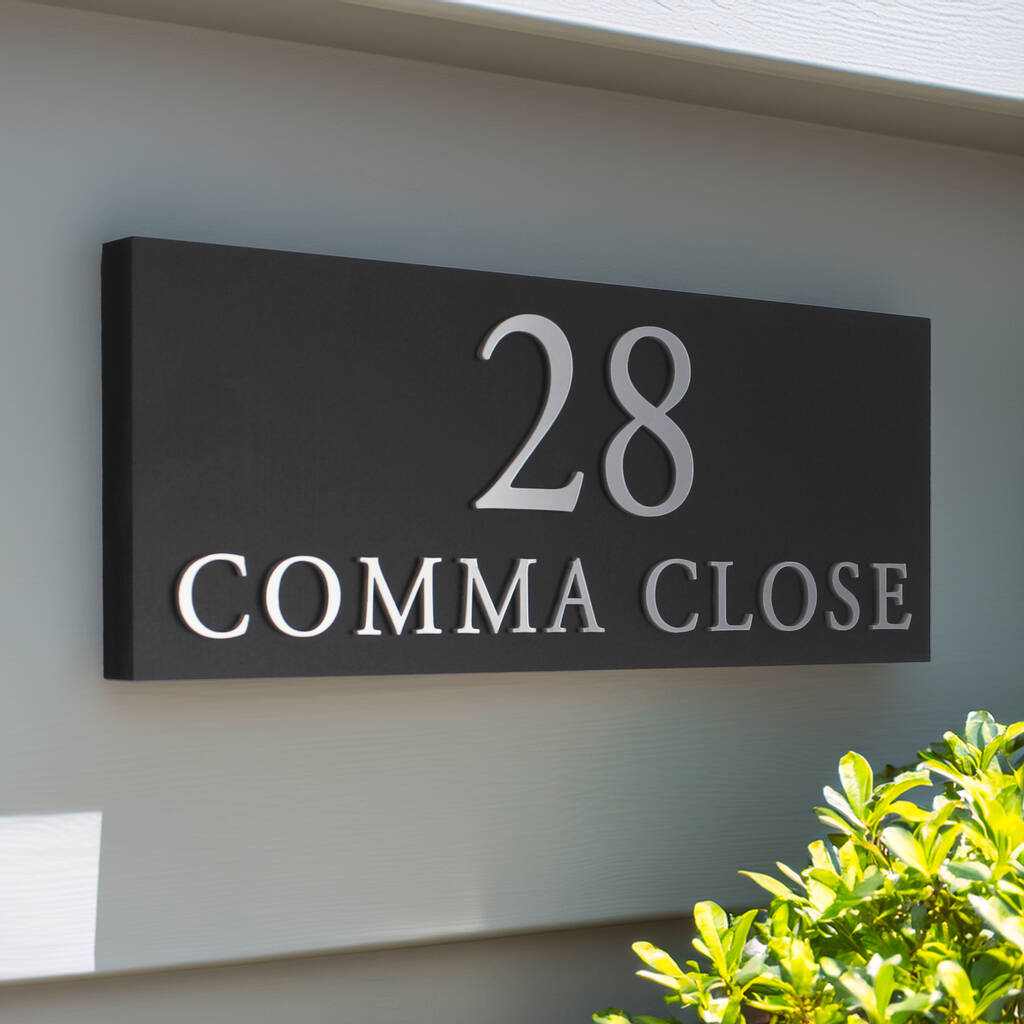Captivating and practical, this meticulously designed contempoary outdoor house sign in matte black with raised silver lettering,