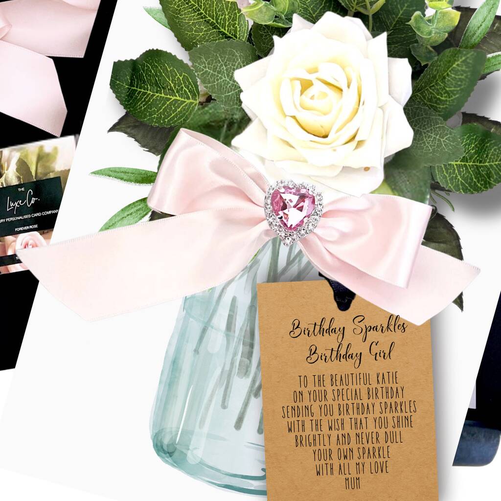 This card is presented with a bow tie on the box, this is supplied pre tied inside so that you can easily slip on prior to gifting. You can choose the colour for the bow tie for the box and the front of the bouquet. In this design we recommend baby pink.