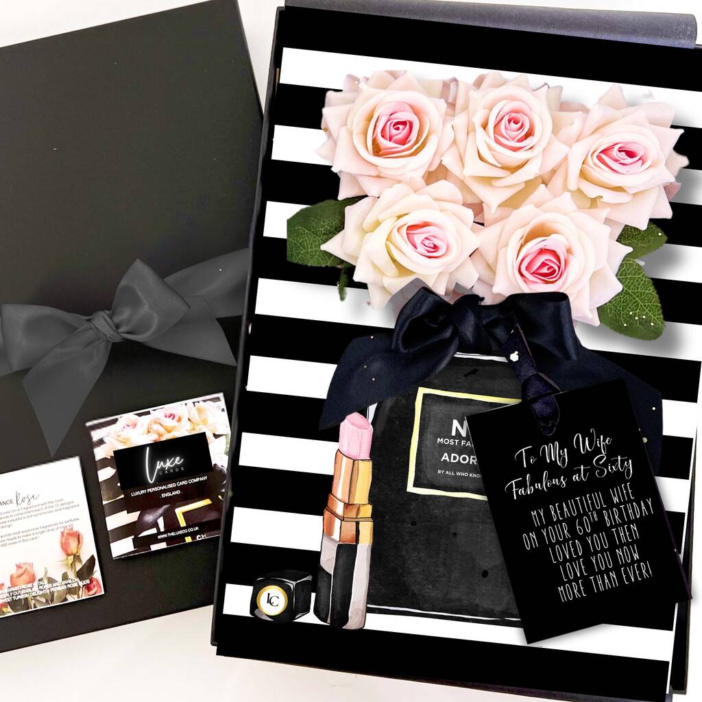 More like a gift, these 60th handmade wife birthday cards come in luxury gift box tied with a big birthday bow in your choice of colours. Let us personalise the message on the front tag and inside free of charge to make a unique personalised 60th birthday gift. Not just 60th birthdays - this design works well as a birthday card for every special age birthdays. And also works beautifully for a Daugter, Mother, Sister on Her Birthday.