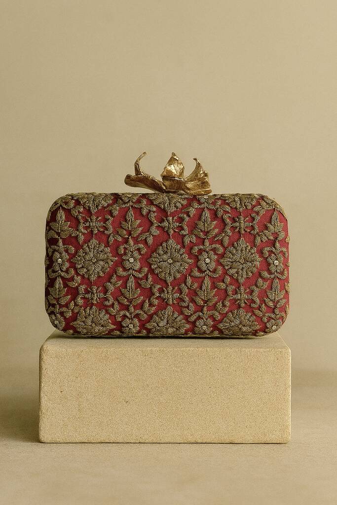 Delhi Flower Clasp Dark Red Silk Clutch | Bridal Evening Bag