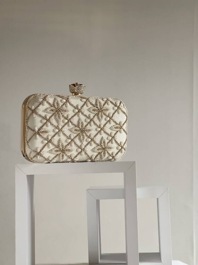 Cream Embroidered rectangle clutch bag with flower clasp bridal bridesmaids gift | Diwali Gift Introducing JORDAN