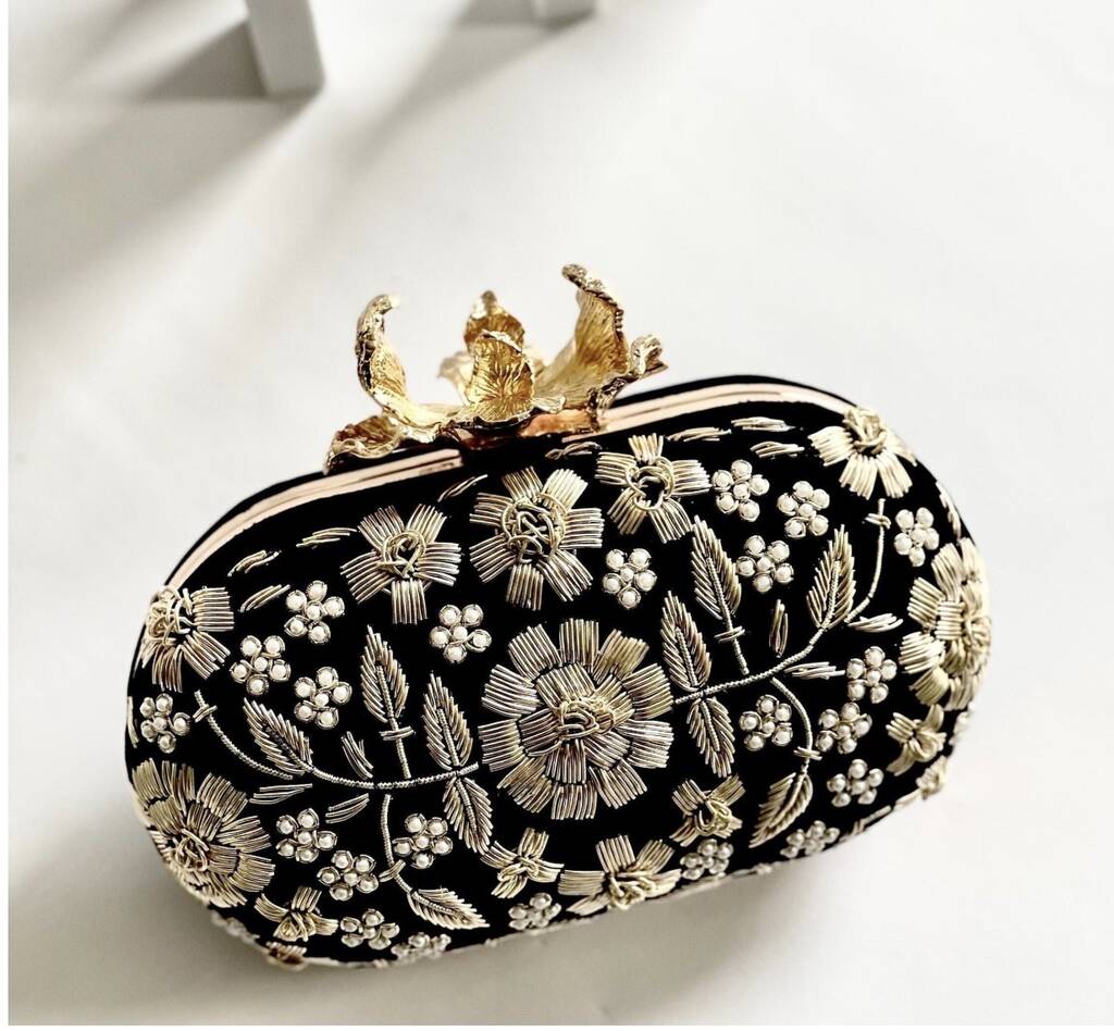 Green Floral Embroidered Clutch bag | Handmade clutch purse | Gift Ideas for her The statement oval Clutch with the magnificent work of Zardosi, dabka and pearls with the most beautiful flower clasp.
