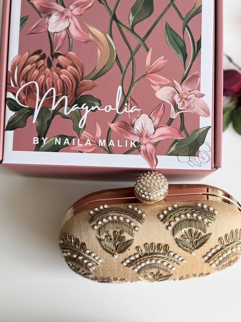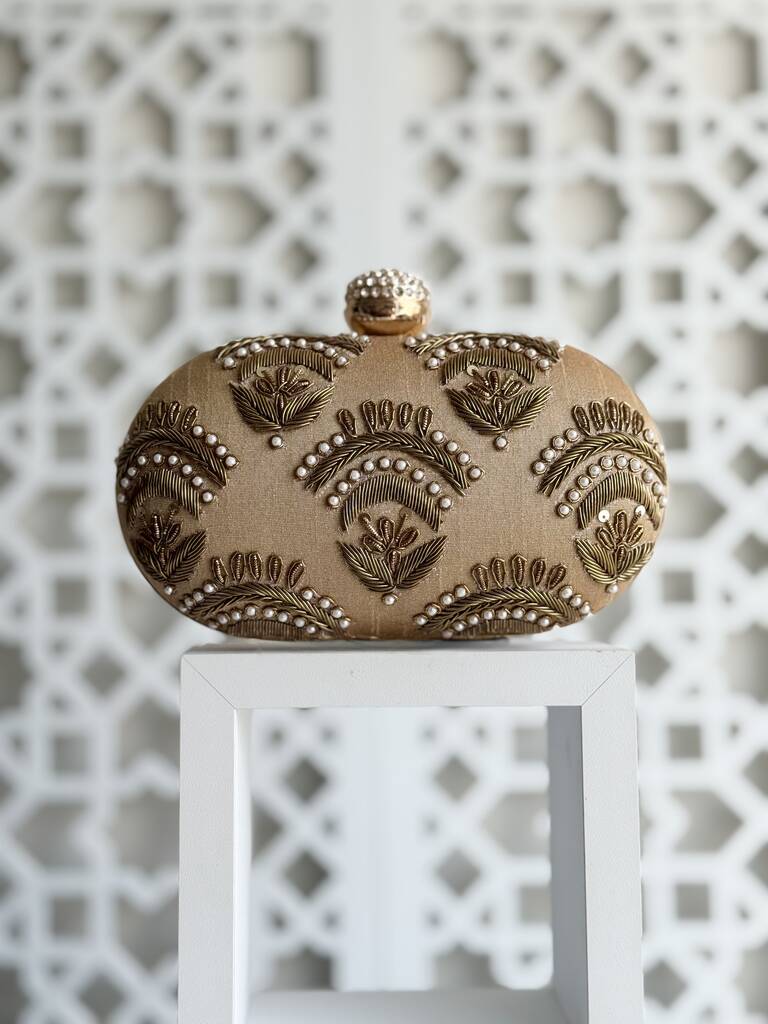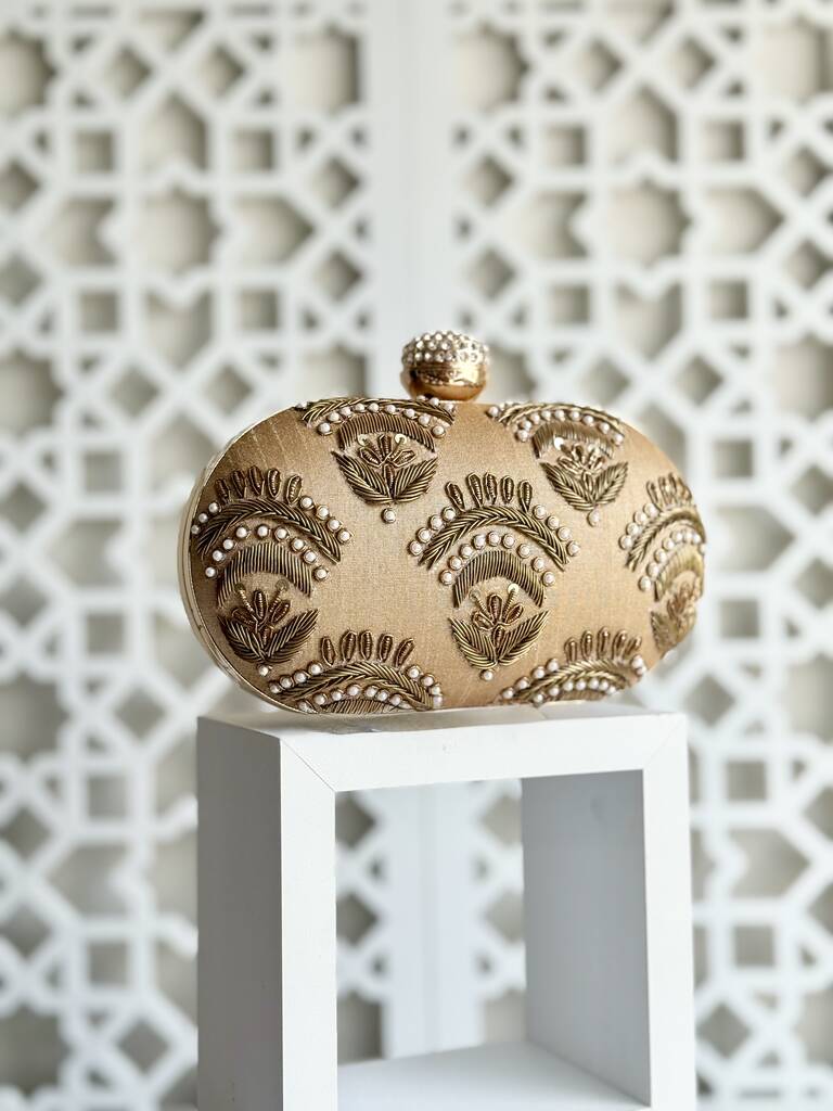 Valeria Gold Embroidered Embellished Oval Clutch Bag