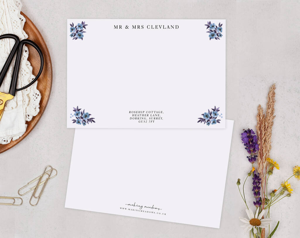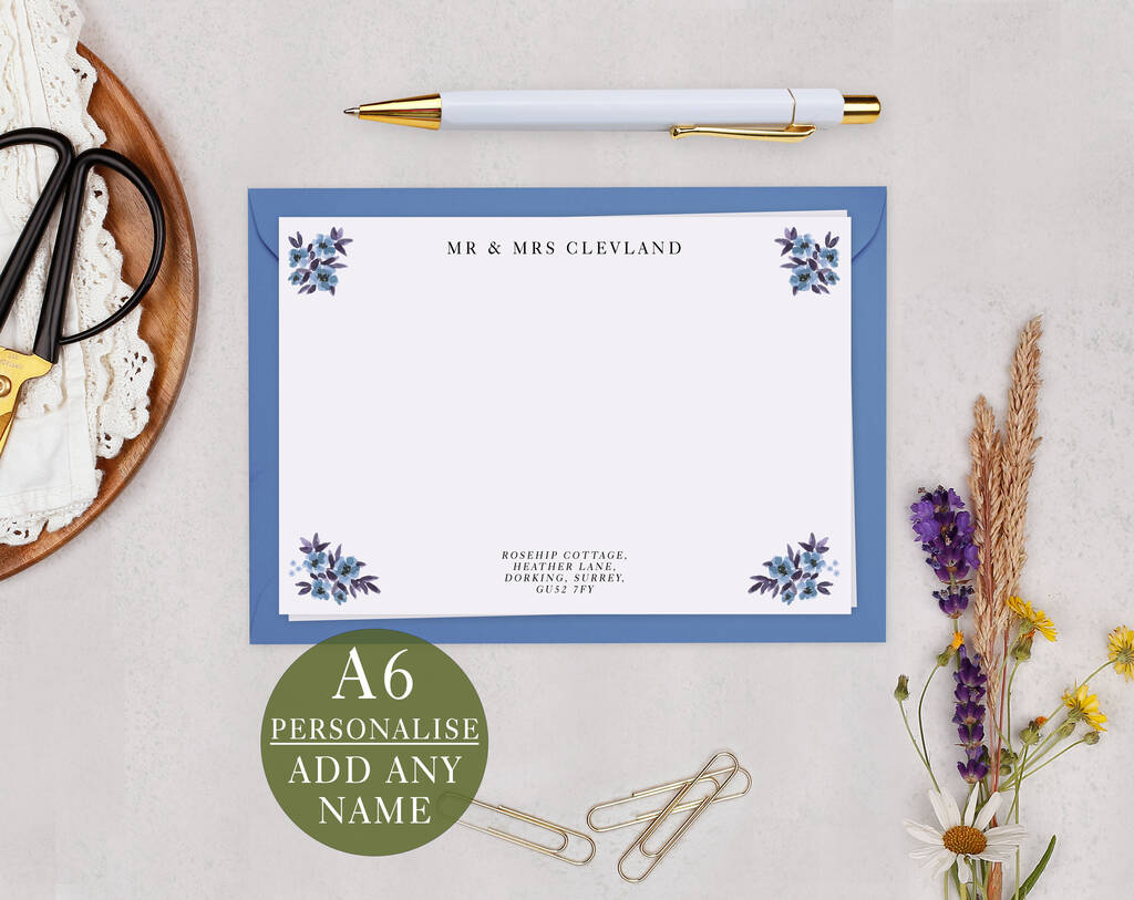 Blue Floral Personalised Address Note Cards A6 Notecard Set