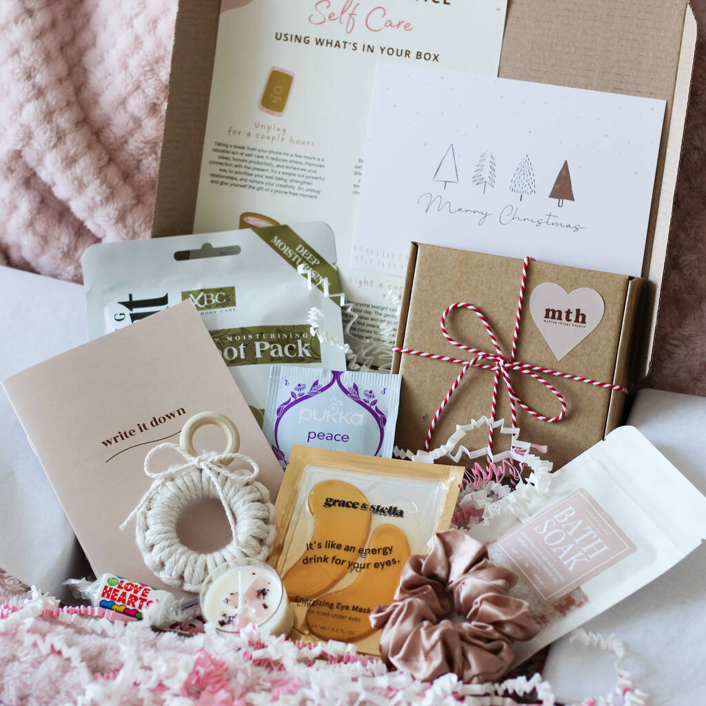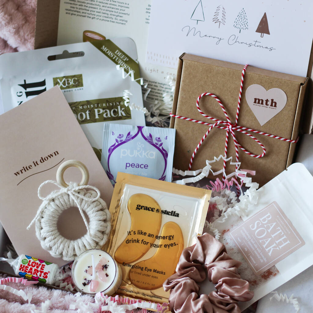 - Please always consider the ingredients and allergens of the goodies within your gift box!- The hampers may vary slightly depending on stock - the colour of the scrunchie, the brand of foot mask, the colour of journal etc.