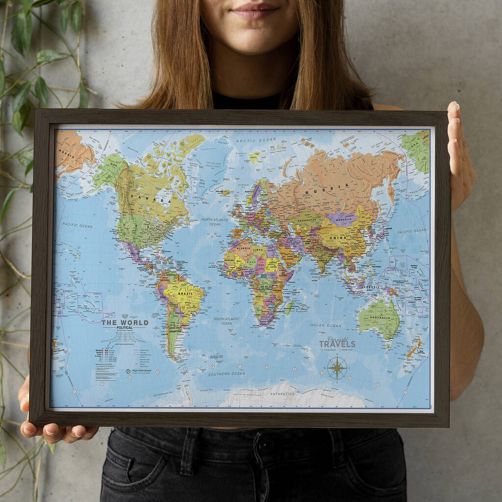 This black framed canvas pinboard world map is perfect for tracking everywhere you’ve been — and everywhere you’re going next.Turn your wall into a travel story with this black framed canvas pinboard world map, perfect for tracking where you’ve been and planning where you’ll go next. Use the included assorted map pins to mark past adventures, future dream destinations, or even plan a gap year in a fun and visual way. The map features an updated political design, with every country shown in a different colour, plus hill shading and time zones for extra detail. Each map is mounted onto a foam-centred, pin-friendly board and arrives flat and fully framed.