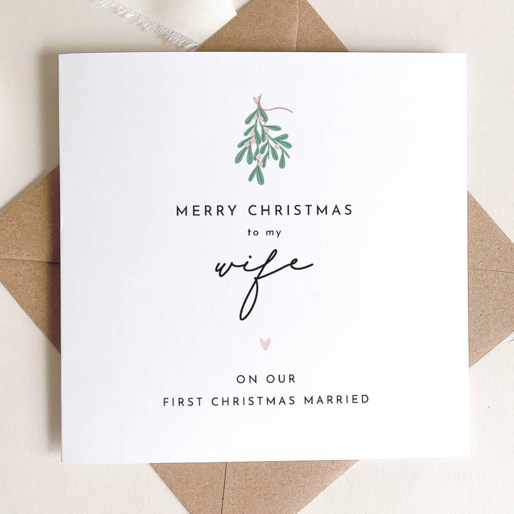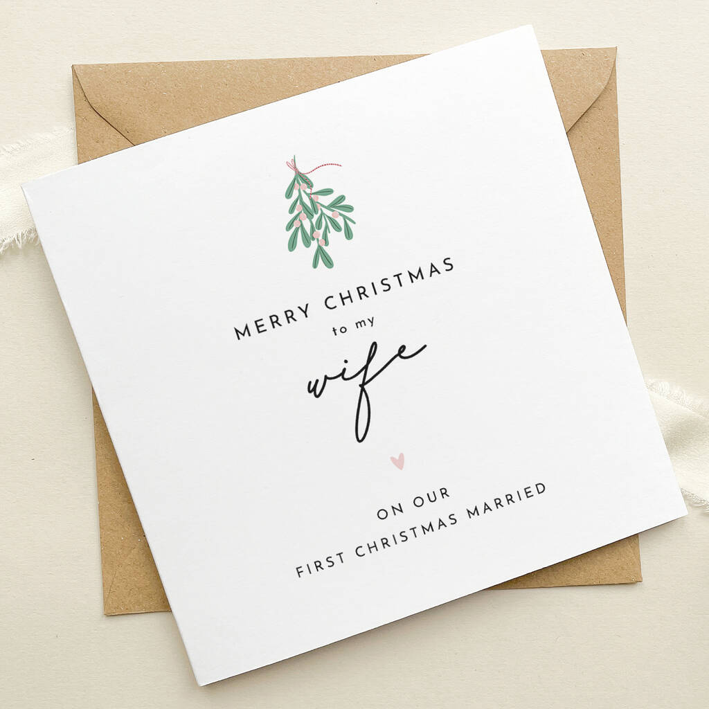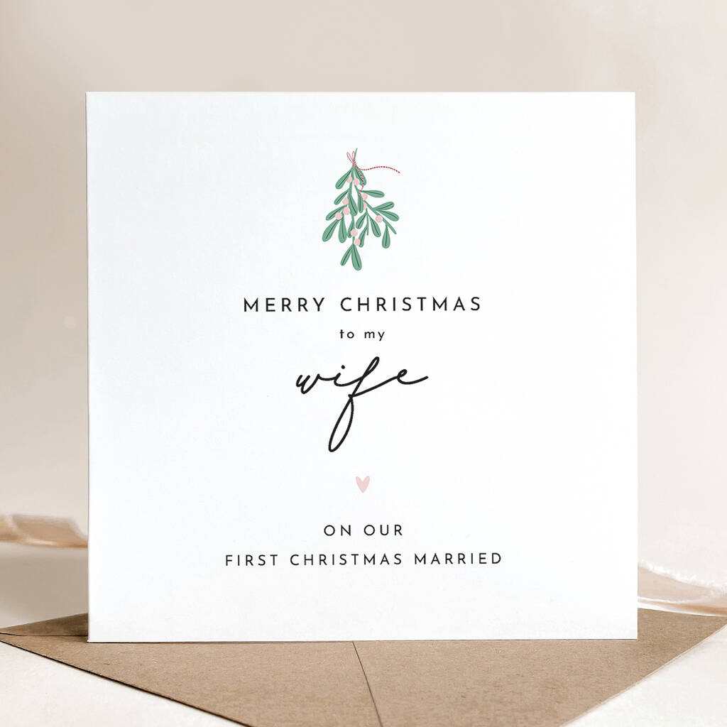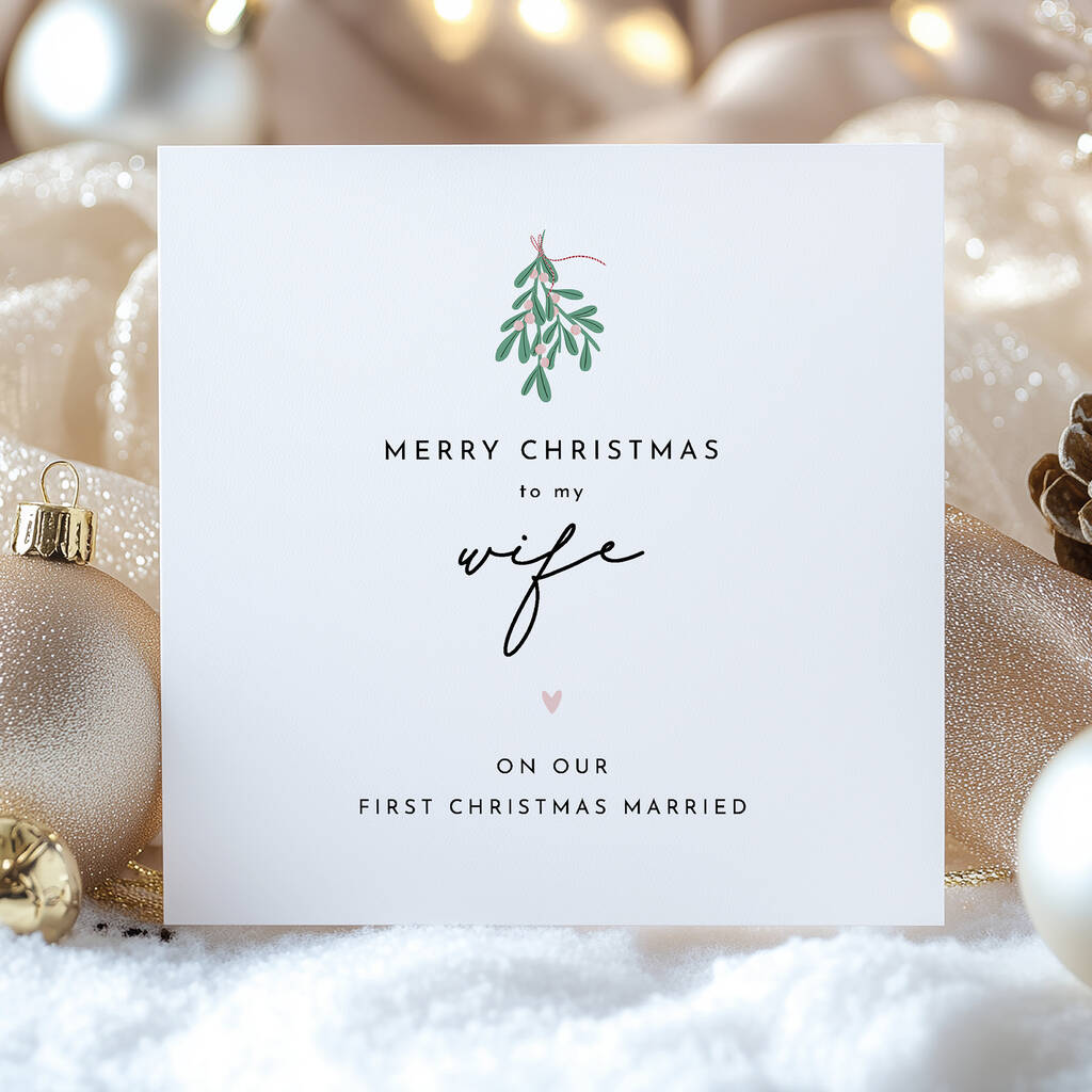 Wife / Husband First Married Christmas Card: Mistletoe And Pink Heart Design