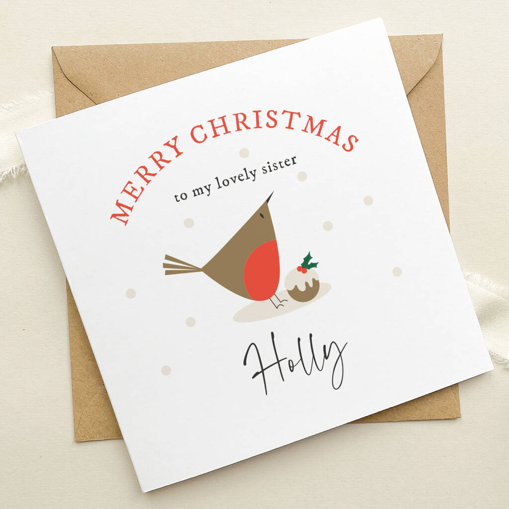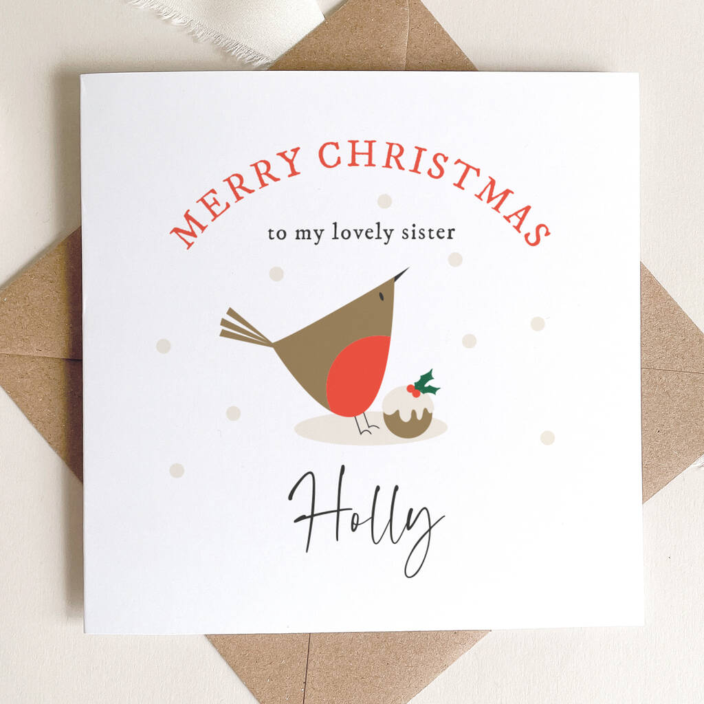 Personalised Christmas Card For Sister: Robin With Christmas Pudding Design