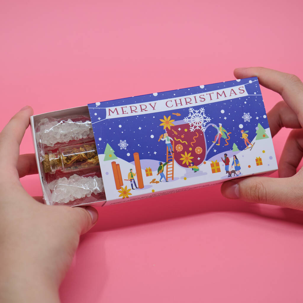 A little box of festive magic! This charming matchbox contains everything you need to transform a simple bottle of wine, apple juice or cider into a warming winter treat.