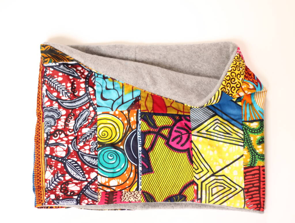 Colourful Cosy Winter Snood for allColourful Handmade Patchwork African Wax Print Snood with super soft organic cotton fleece lining.