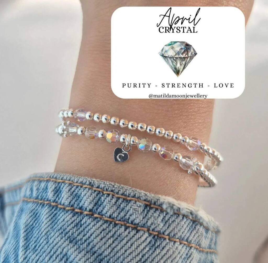 Sterling Silver April Crystal Personalised Heart Bracelet Set Of Two Stacking Bracelets: April Birthstone Stacking Jewellery